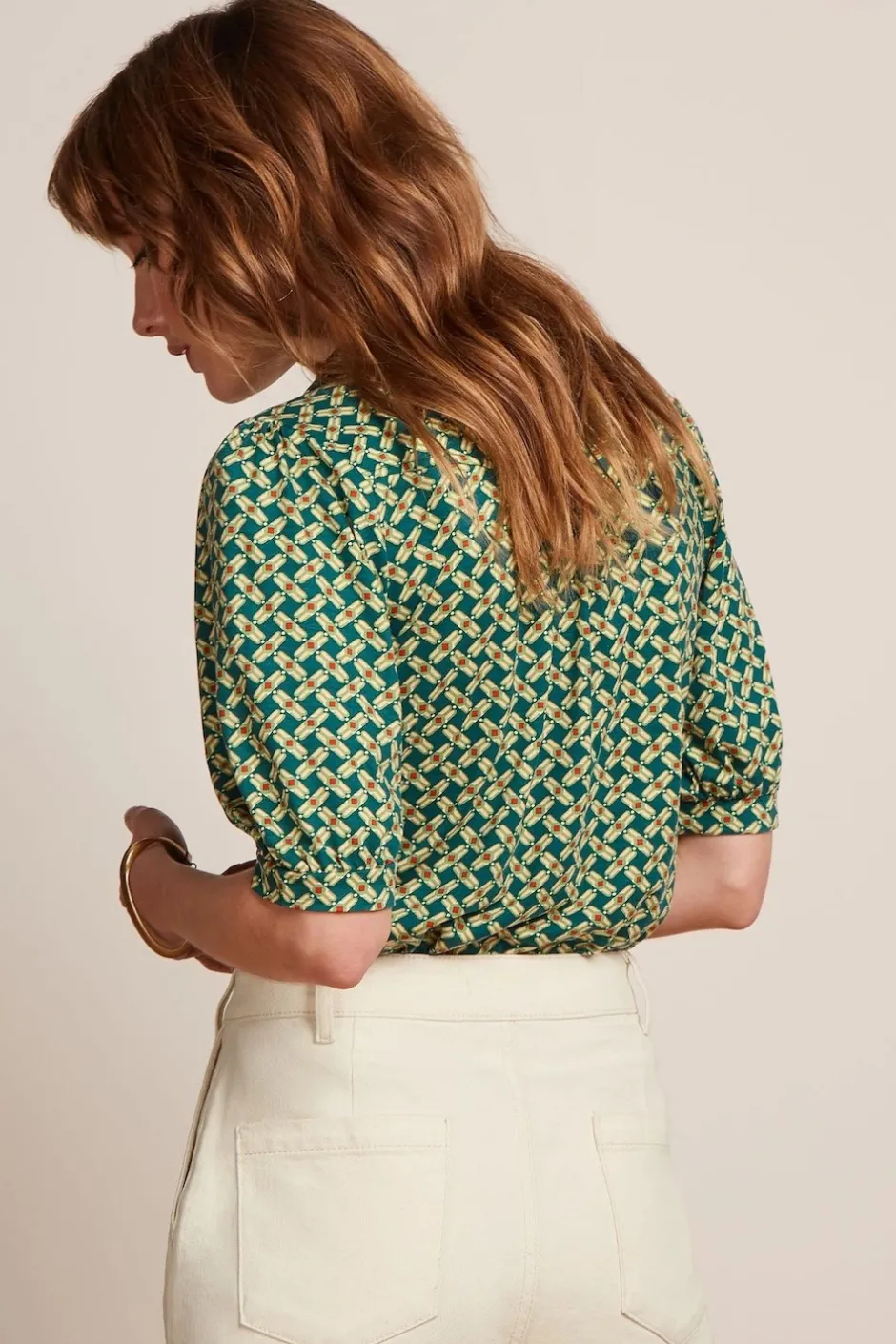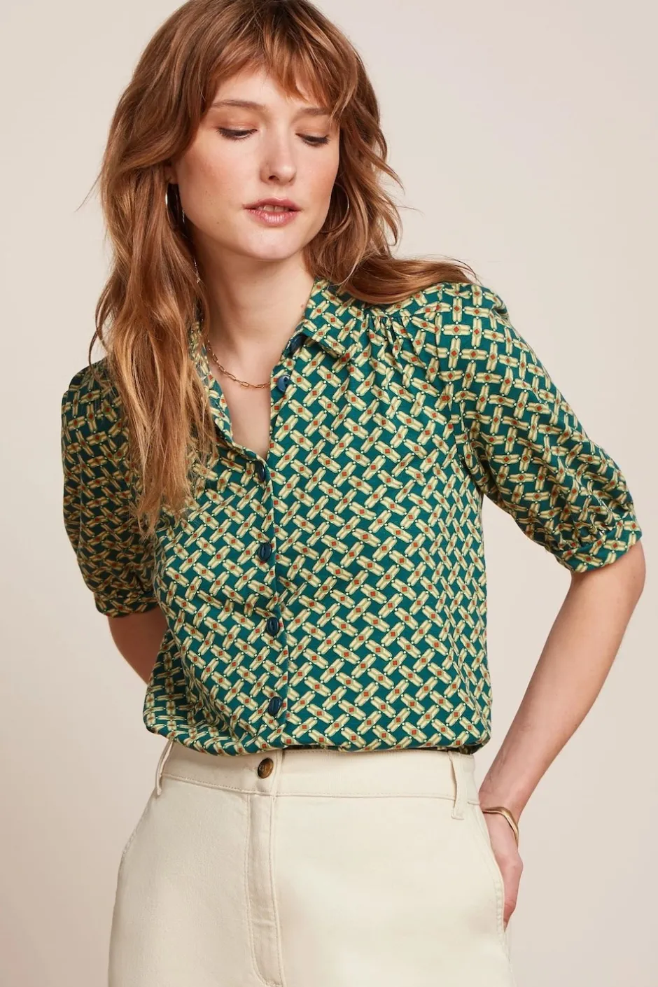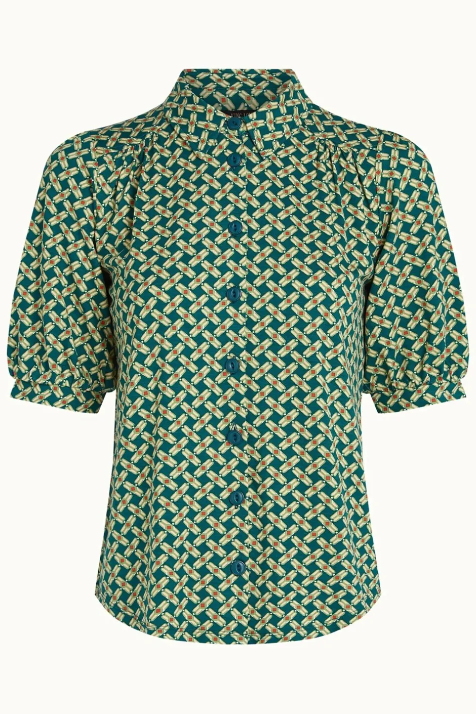 Skjortblus från holländska märket King Louie. Blus med luftig och kort ärm med en liten puff. Blusen är sydd i skön och stretchig viskostrikå. Skjortan har en nätt krage och knäppning hela vägen framtill.