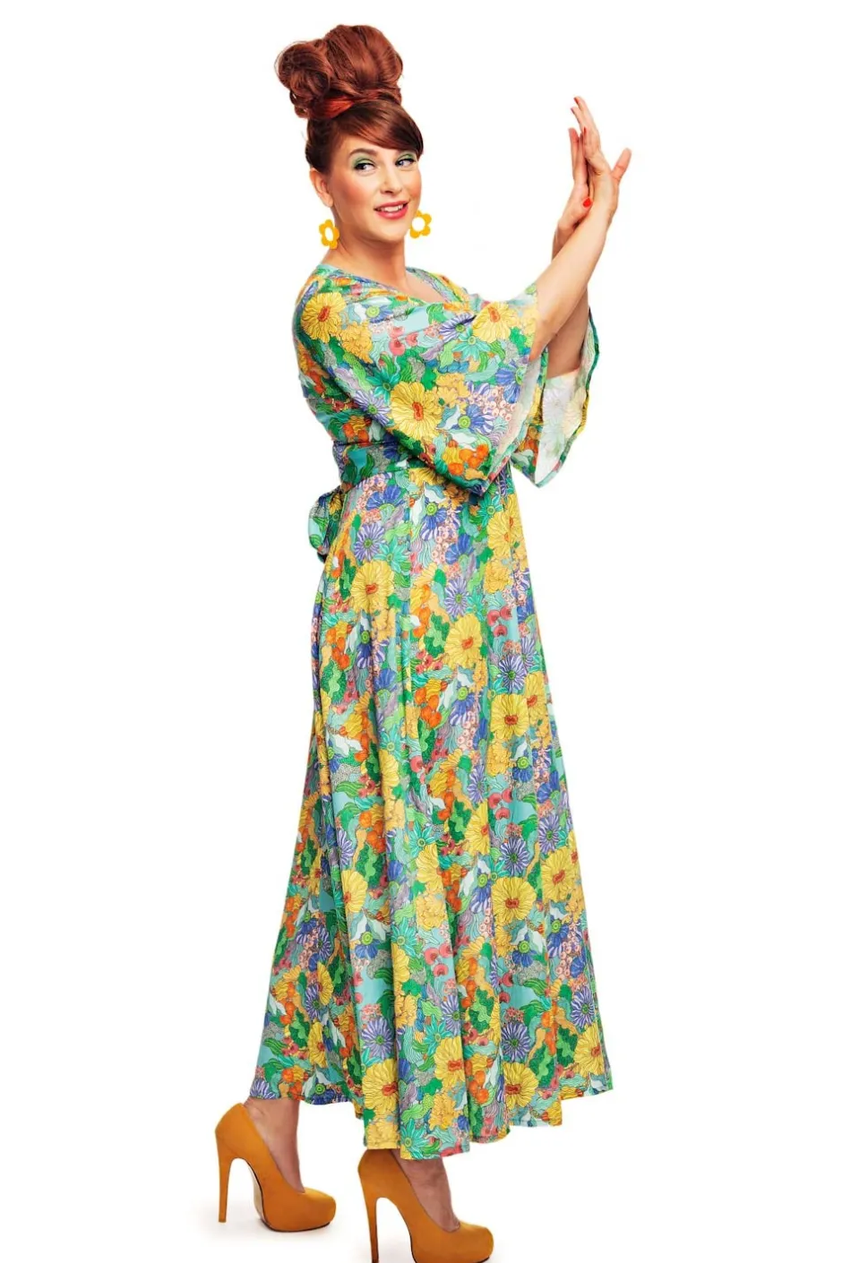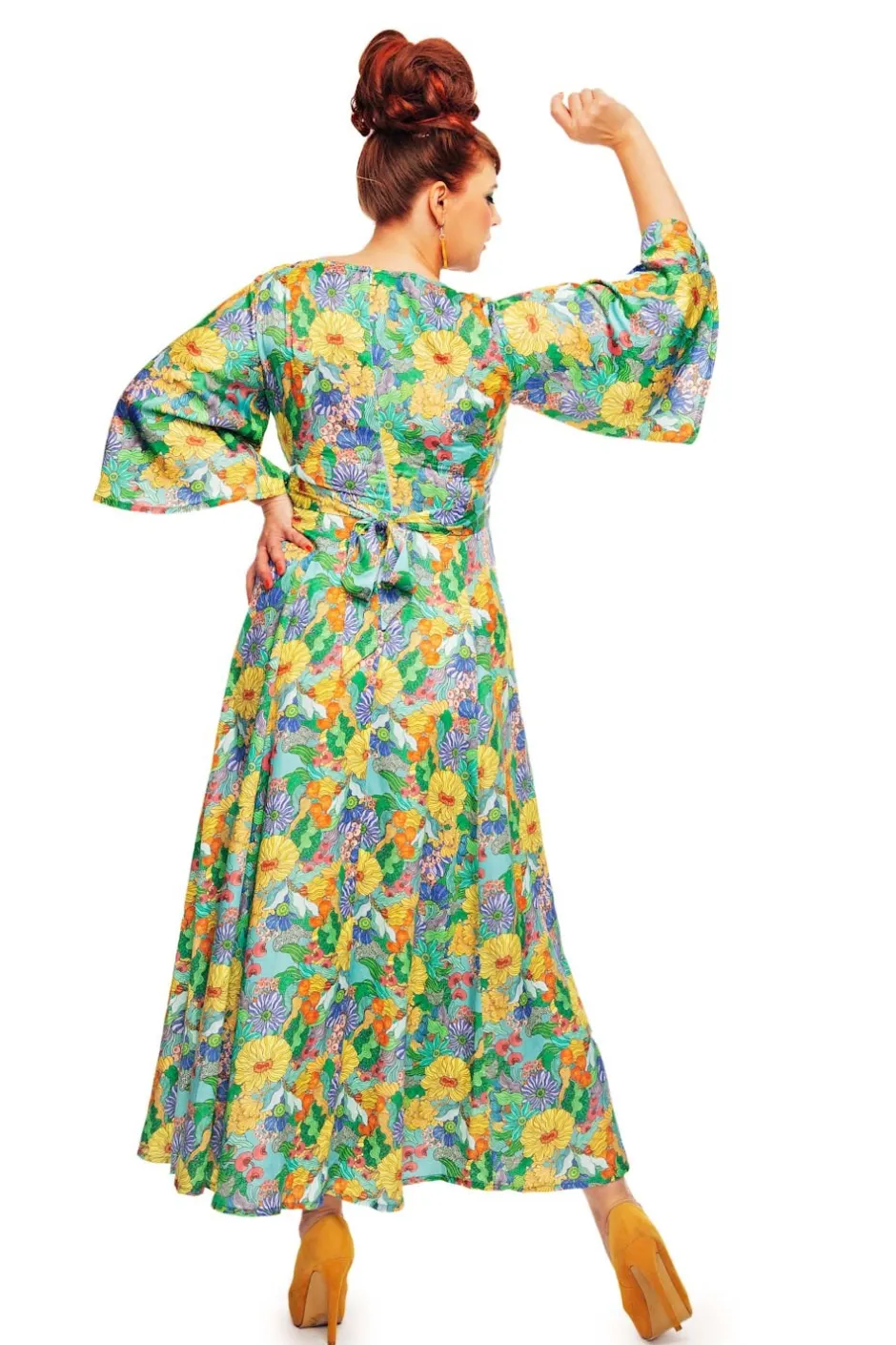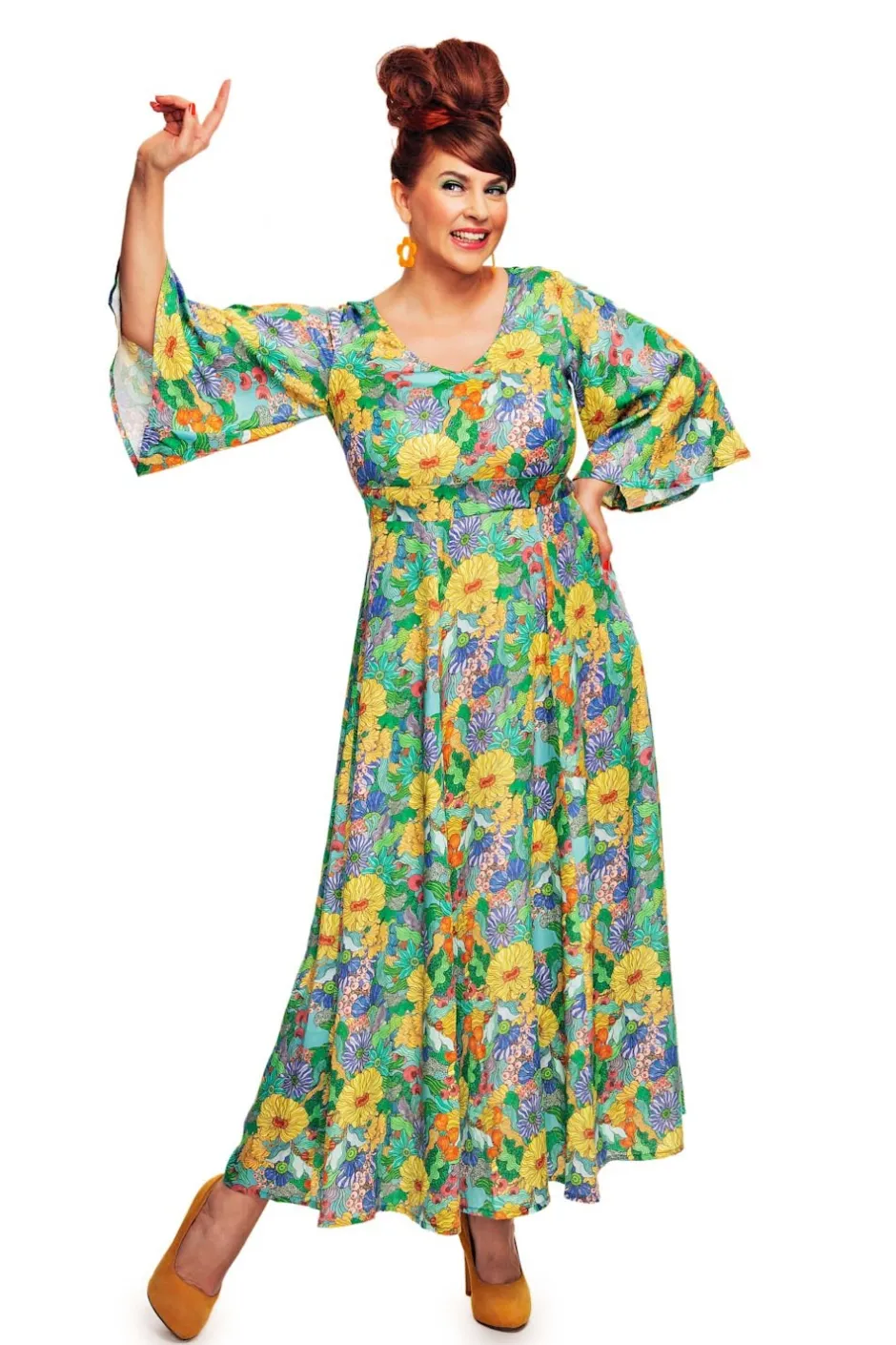 Greta är en elegant och klassisk klänningsmodell i Tencel med trumpetärm i 70-talsanda från vår egen Cissi och Selma kollektion. Klänningen har en vacker v-formad ringning, en skärning under bysten med knytband bak i ryggen. Kjolen är tårtbitsskuren och har ett fint fall och vidd. Klänningen är lång men inte hellång så den passar även till den som är lite kortare. En bekväm festklänning eller vardagsklänning att bo i hela sommaren.