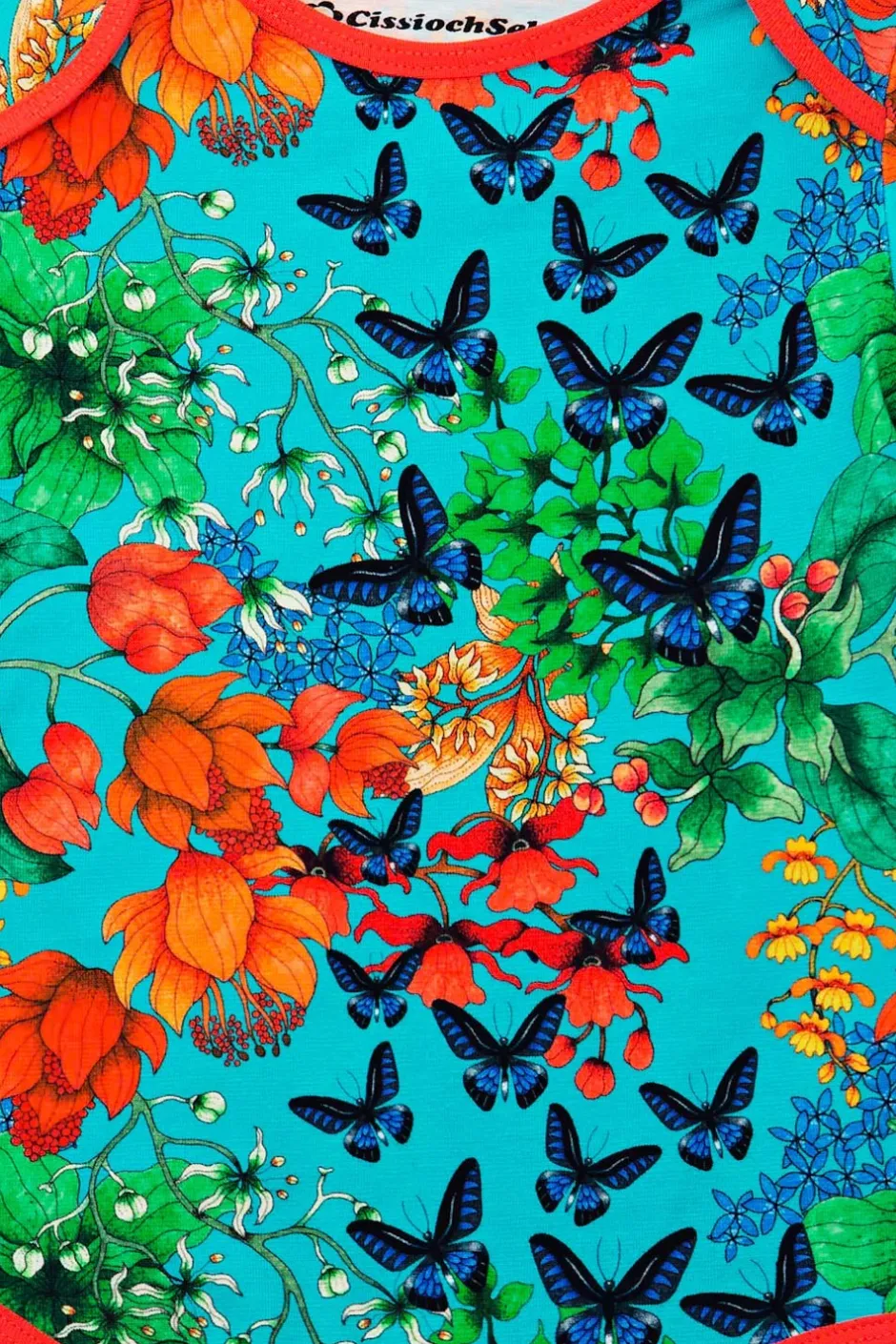 Tyget heter Fjärilar och har en ljusblå botten med fjärilar i röd och mörkblå.
