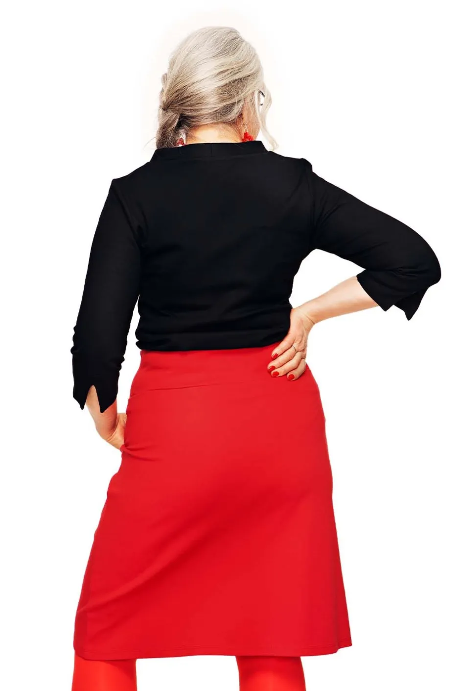 Majken är en bekväm kjol i en stadig viskostikå med figurnära passform. Kjolen har fickor och bred mudd i midjan. Längden är till strax ovanför knät.