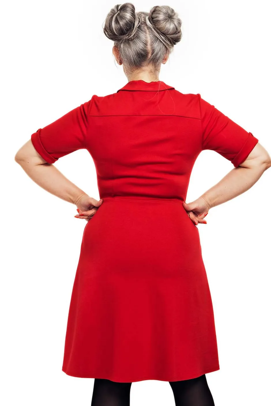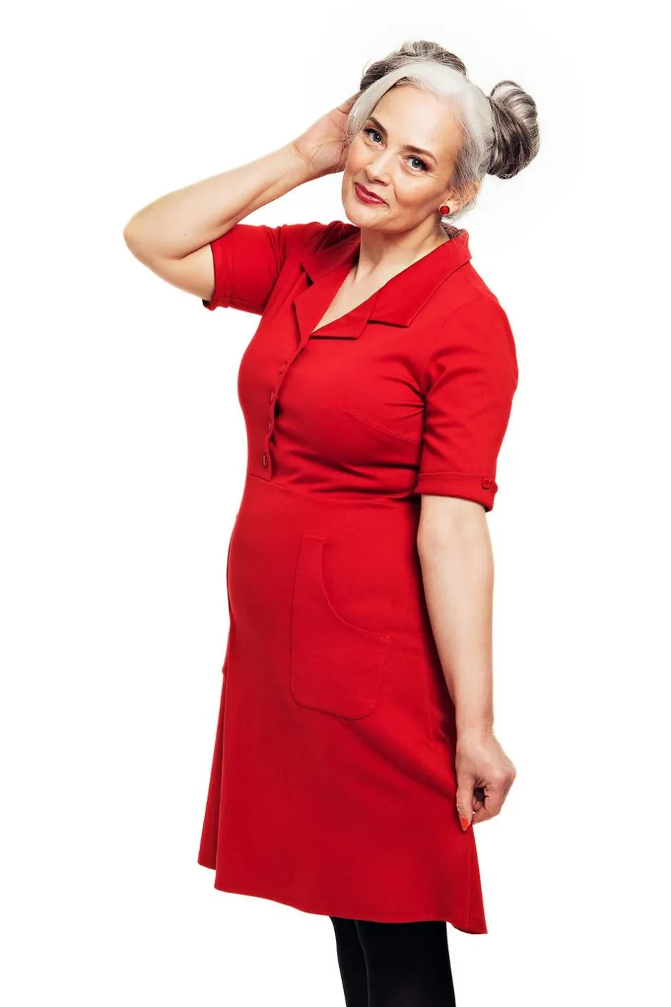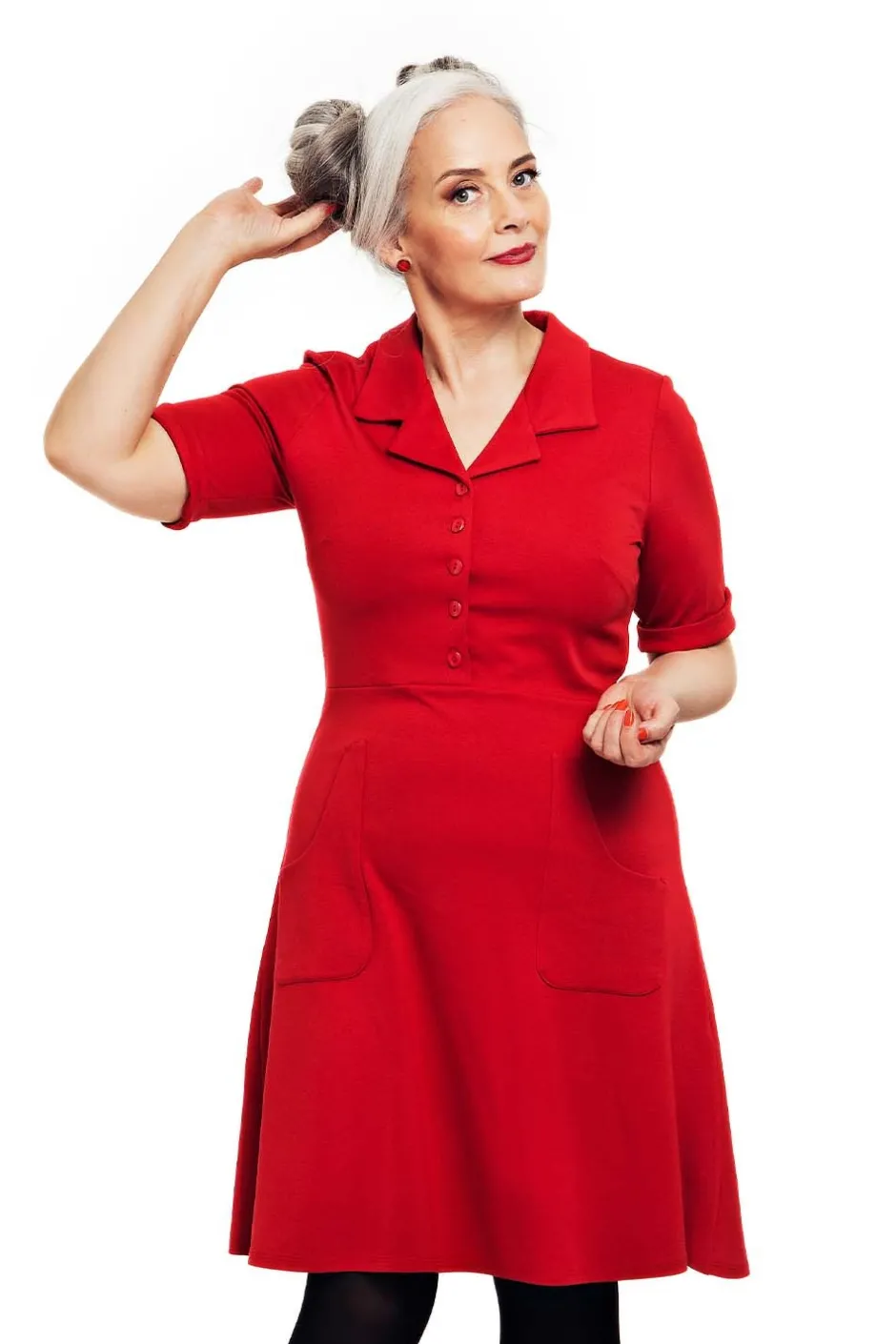 Monica är en skjortklänning i trikå. Modellen är inspirerad från 70-talet och har fina detaljer med knäppning fram, ärm med uppvik och knapp, krage med slag och påsydda fickor. En klänning att känna sig både bekväm och uppklädd i!