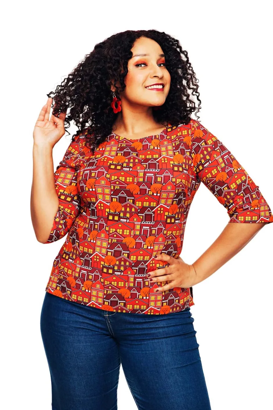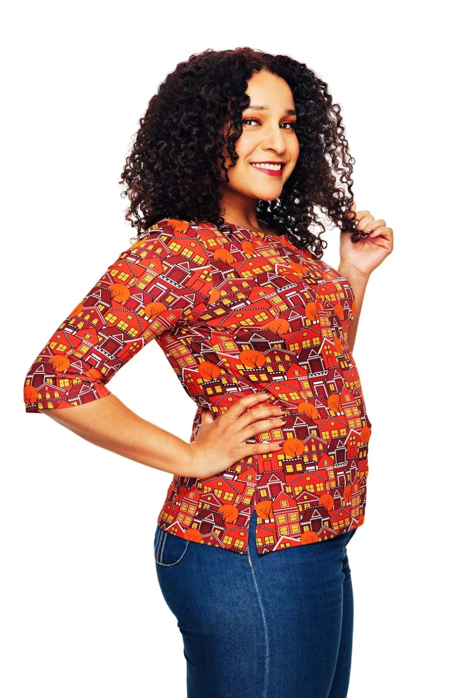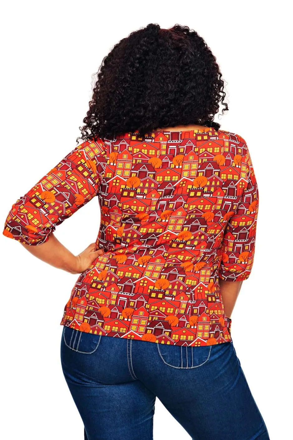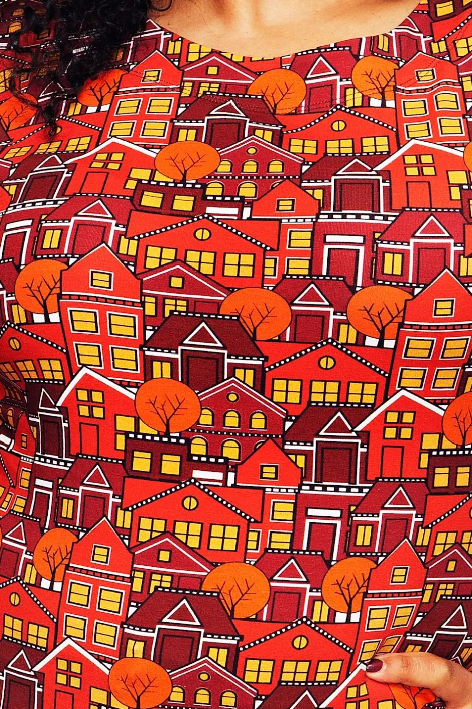 Tyget heter Vår gata orange och är en stadsbild med hus och träd i olika nyanser av rött, orange och gult med detaljer i vitt och svart.