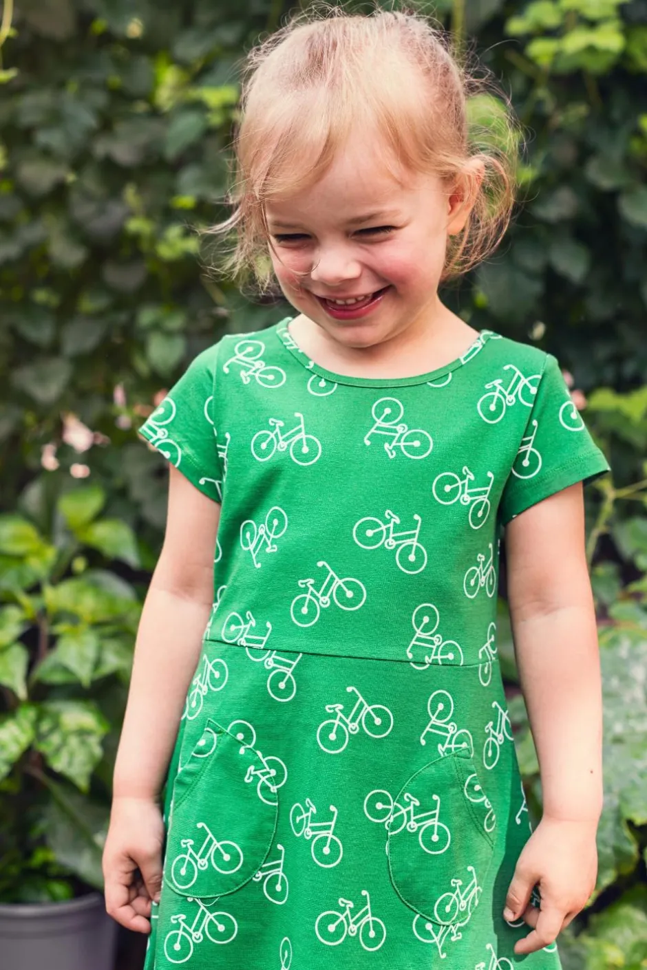 Tyget heter Cykeltur Grön och har en grön bakgrund med vita cyklar.
