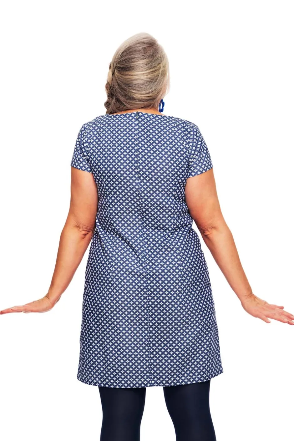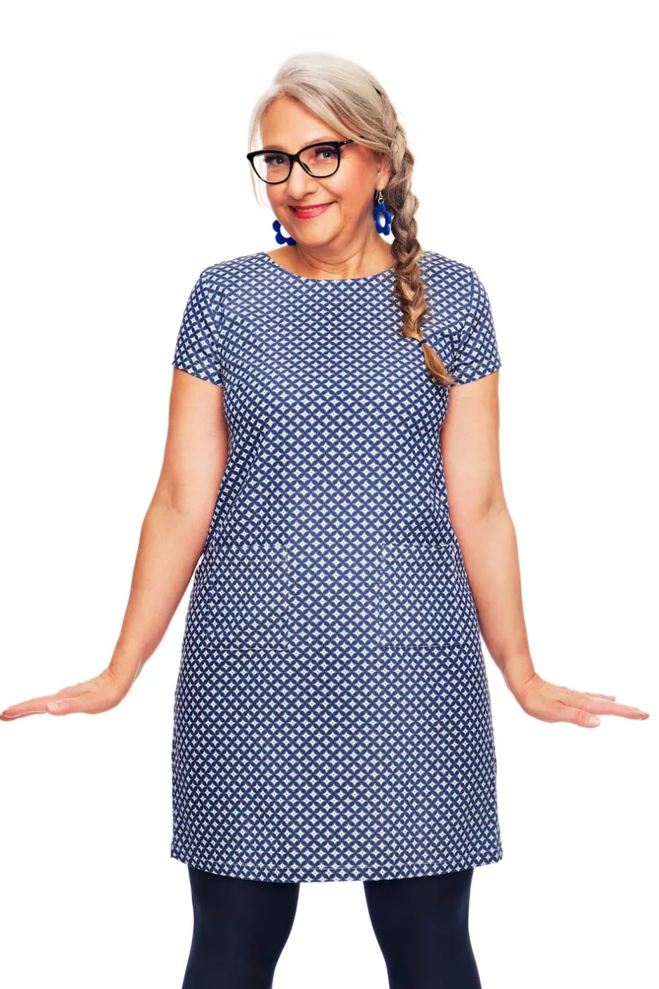 Elna är en något kortare A-formad klänning inspirerad av 60-talet. Klänningen är nättare upptill och har lösare passform nertill. Den har dragkedja i ryggen och två påsydda fickor fram. Klänningen är ofodrad. Elna är en perfekt modell att variera, bär den med strumpbyxor eller mer som en tunika till ett par byxor. Passar lika bra till vardags som till fest.