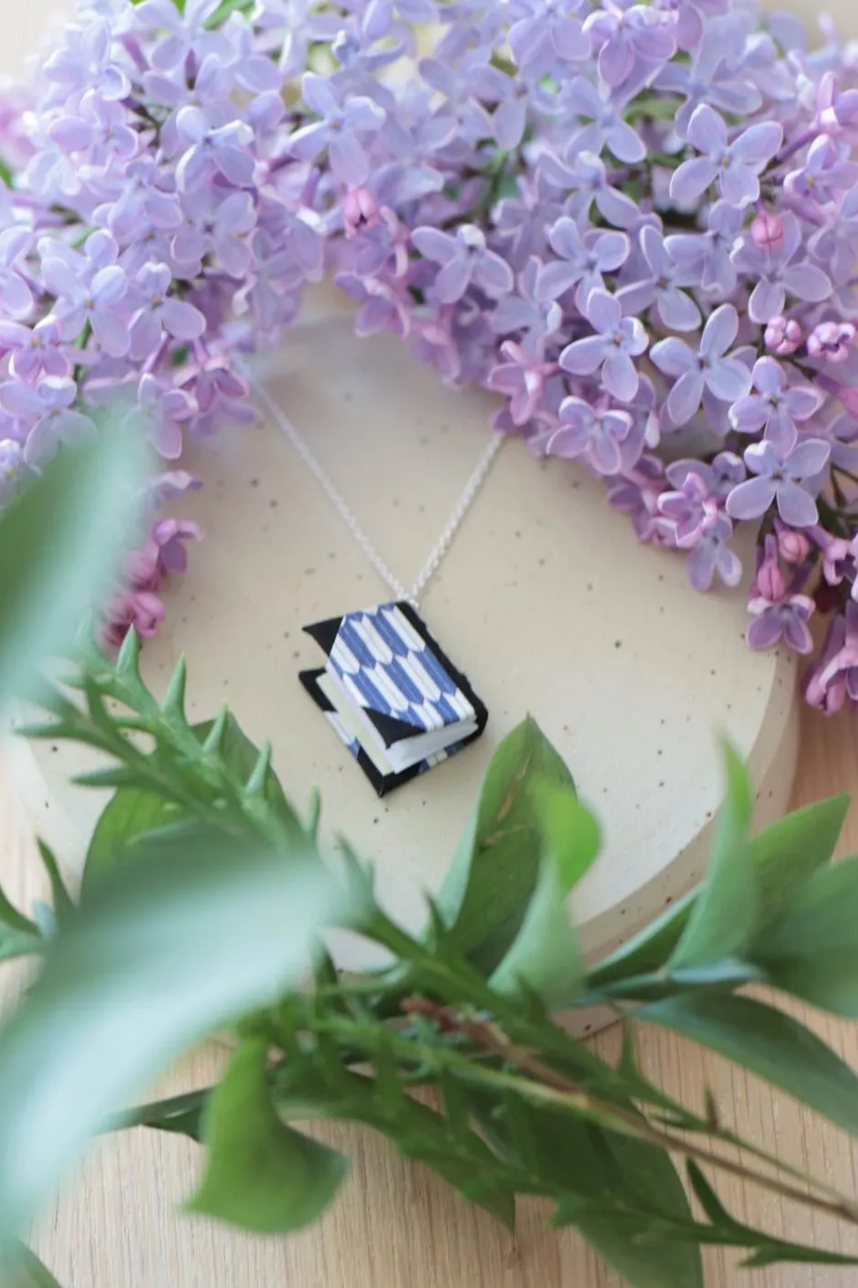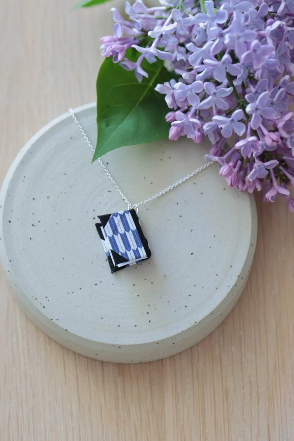 Den här söta boken är handgjord i traditionell bokbindningsmetod. Boken mäter 2,5x2cm och är gjord i papper. Går att kombinera med örhängen i samma serie.