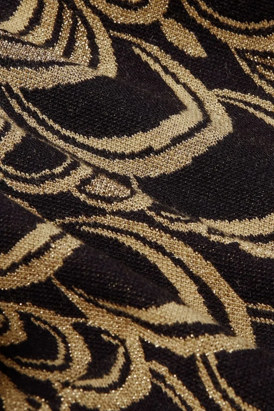 Stickad tunika från Holländska märket King Louie. Tröjan har en figurnära passform med bystinsnitt och slitsar i tröjans sidsömmar. Det 70-talsinspirerade mönstret på tröjan är stickad i ett guld-glittrigt metallgarn som ger tröjan ett elegant uttryck. Tröjan har polokrage och tillhörande skärp som knyts i midjan. En tröja som passar lika bra till festen som till vardagens kyligare höstdagar!