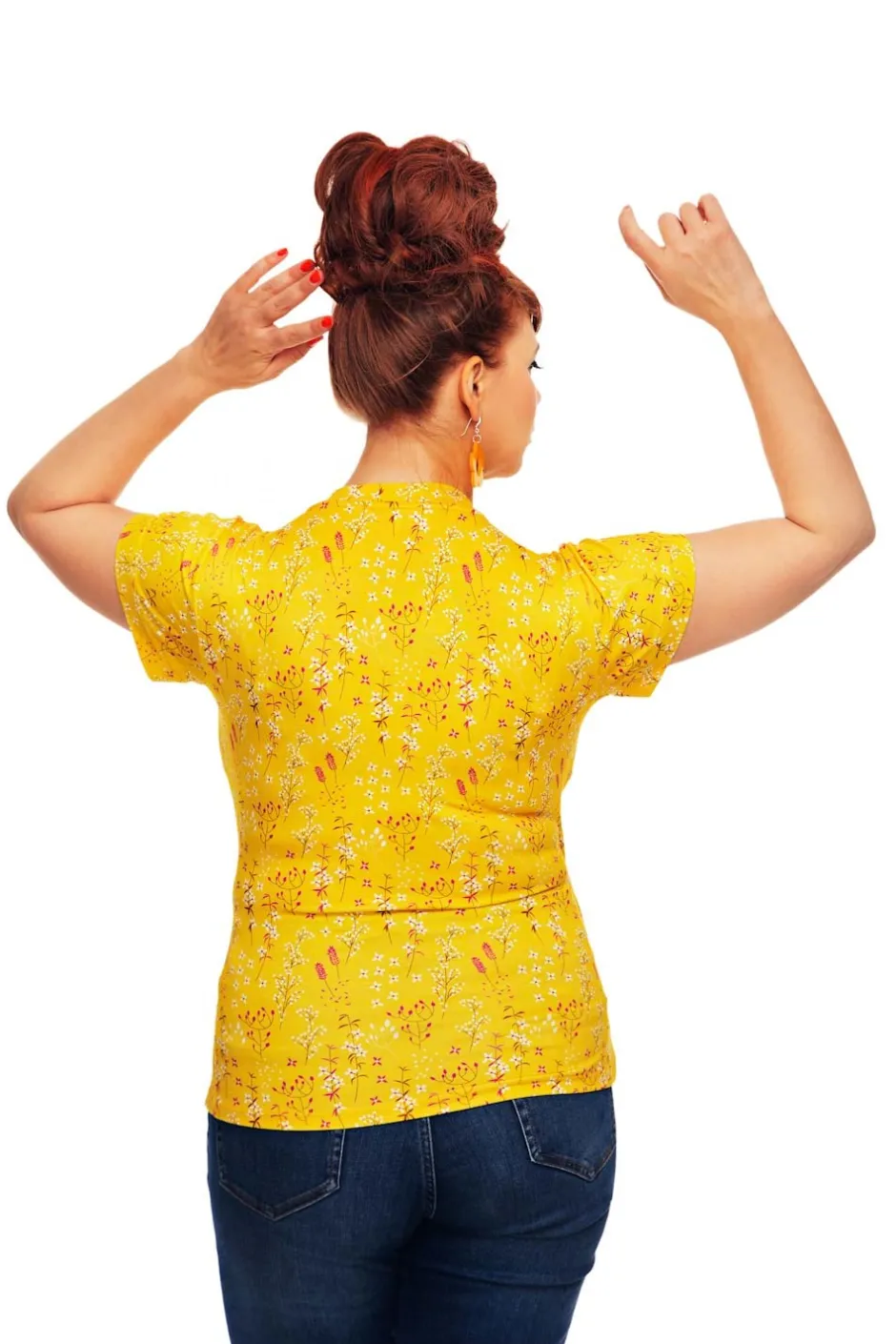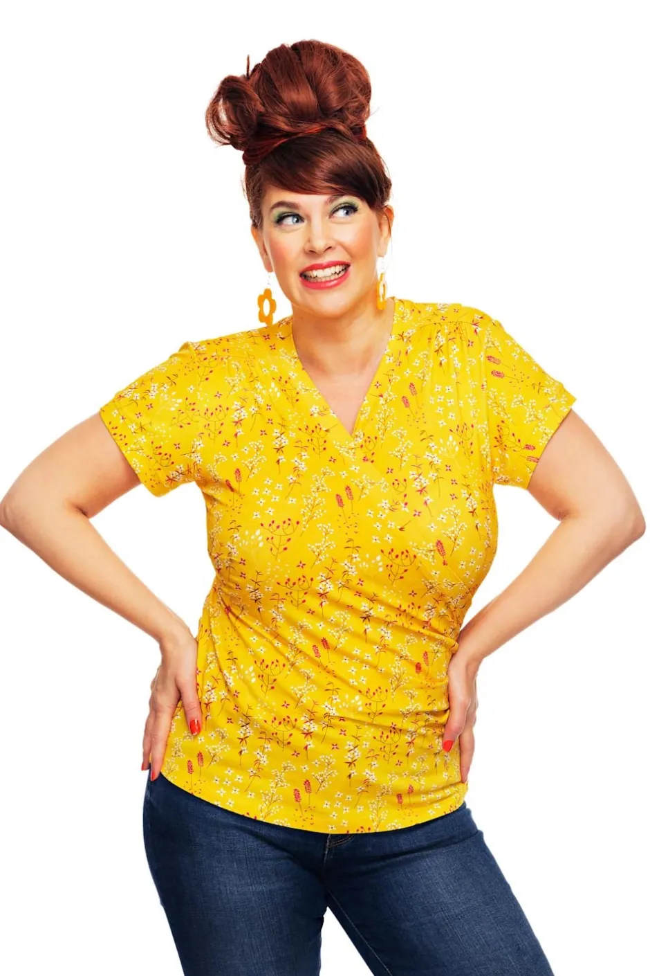 Toppen Jessica är Cissi och Selmas smickrande omlott-topp i mjuk och stretchig viskostrikå! Toppen har en kort ärm med rynkade veck på axeln framtill. Passar bra till både kjol och byxor.