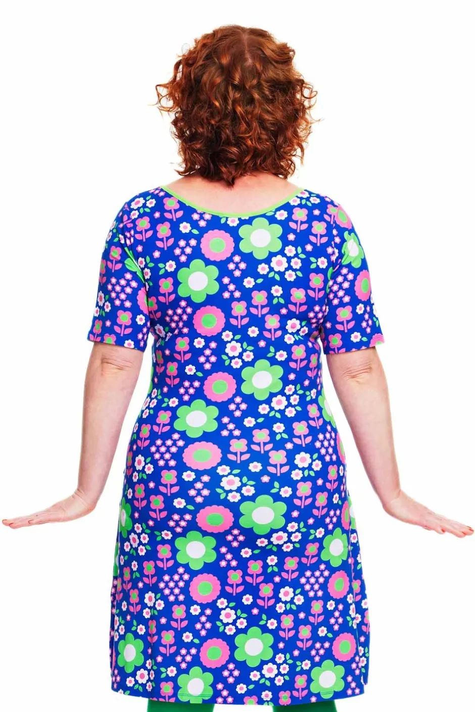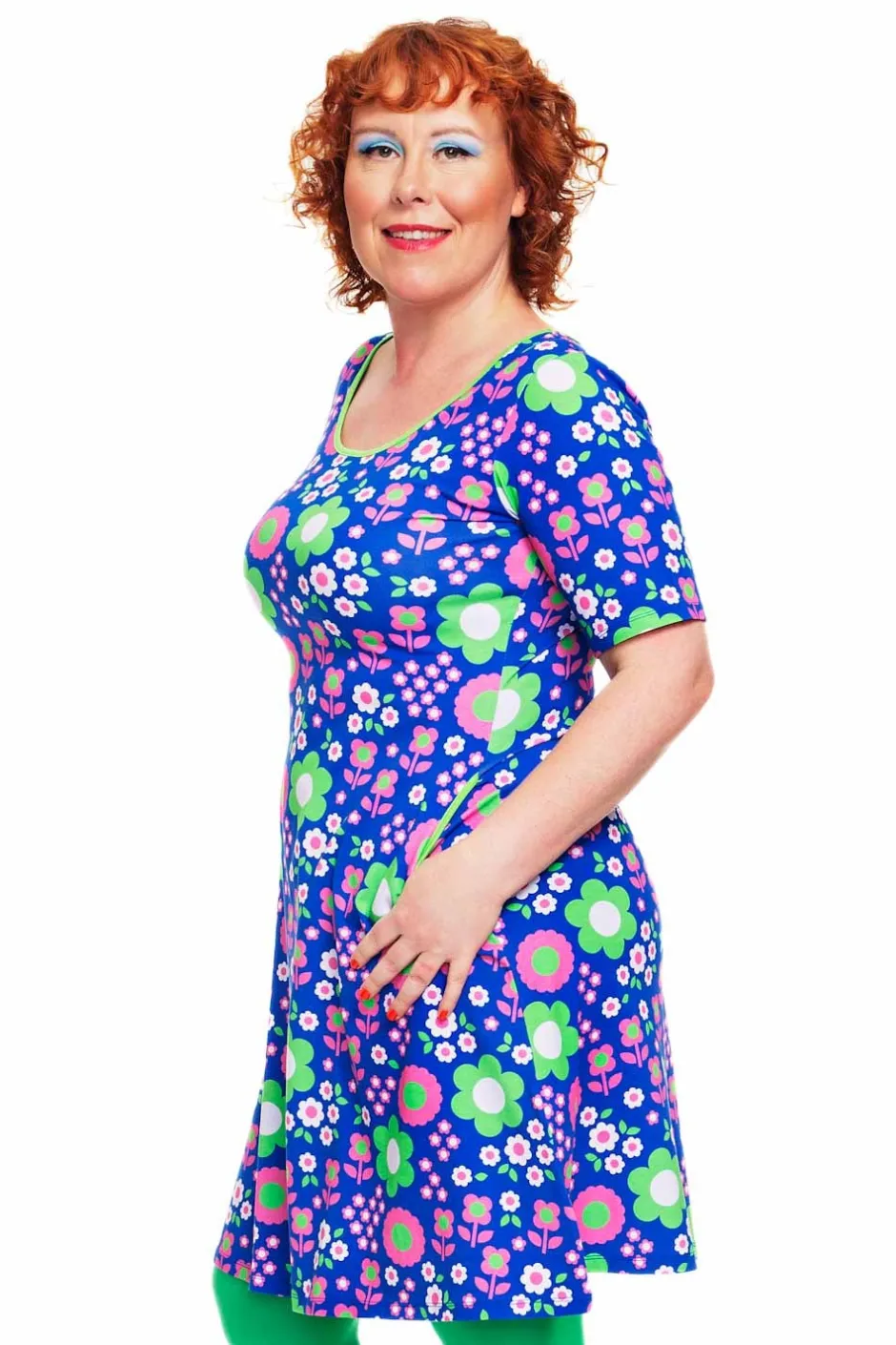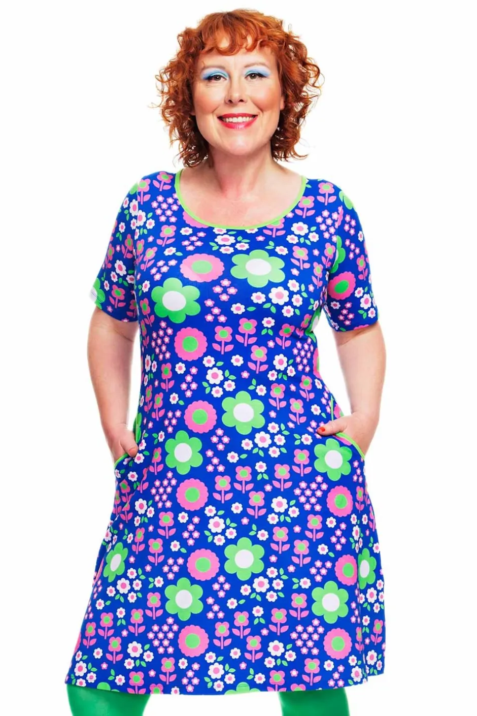 Magda är en trikåklänning utan skärningar med lite vidd i kjolen och perfekt ärmlängd. Klänningen har en elegant halsringning och fickor i sidorna med kontrasterande kantband. Tyget heter Daisy blå och har en blå bakgrund med blommor i vitt, rosa och grönt.