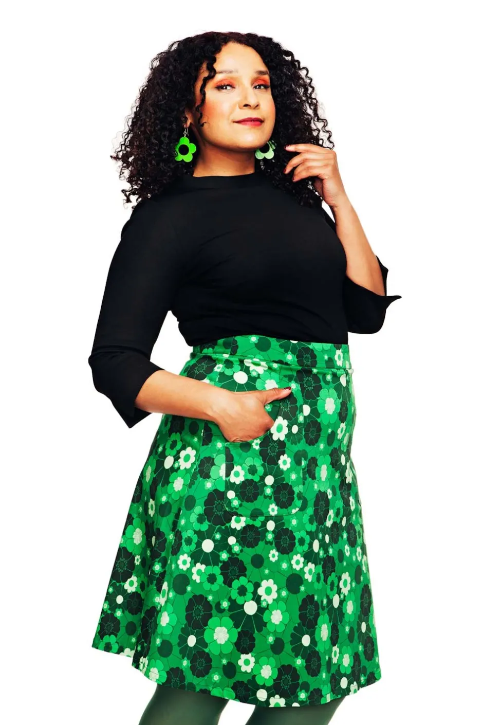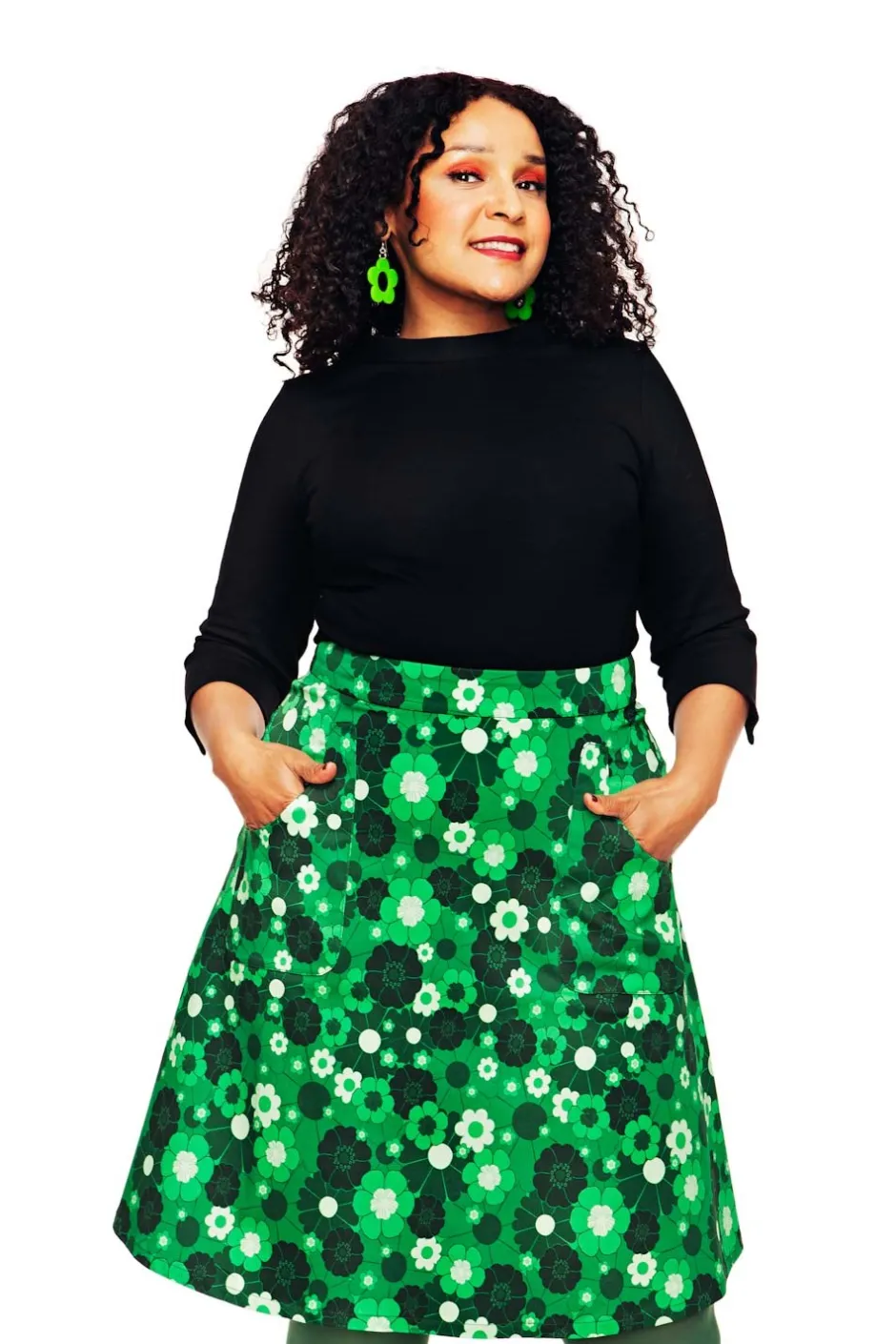 Sonja är en utställd kjol i vävd bomull från Cissi och Selma. Kjolen har stora synliga fickor fram och är fodrad så att den inte hänger upp sig på strumpbyxorna och är lätt att komma i och ur med dragkedja bak.