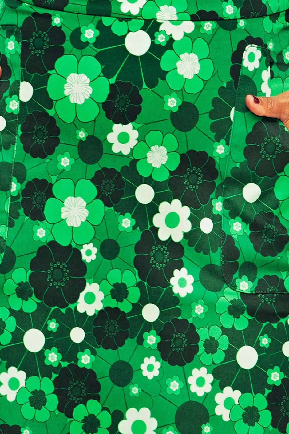 Tyget heter Perspektiv Grön och är en blinkning till gamla retrotyger i en modernare anda. Ett stilistiskt blommönster i olika gröna toner.