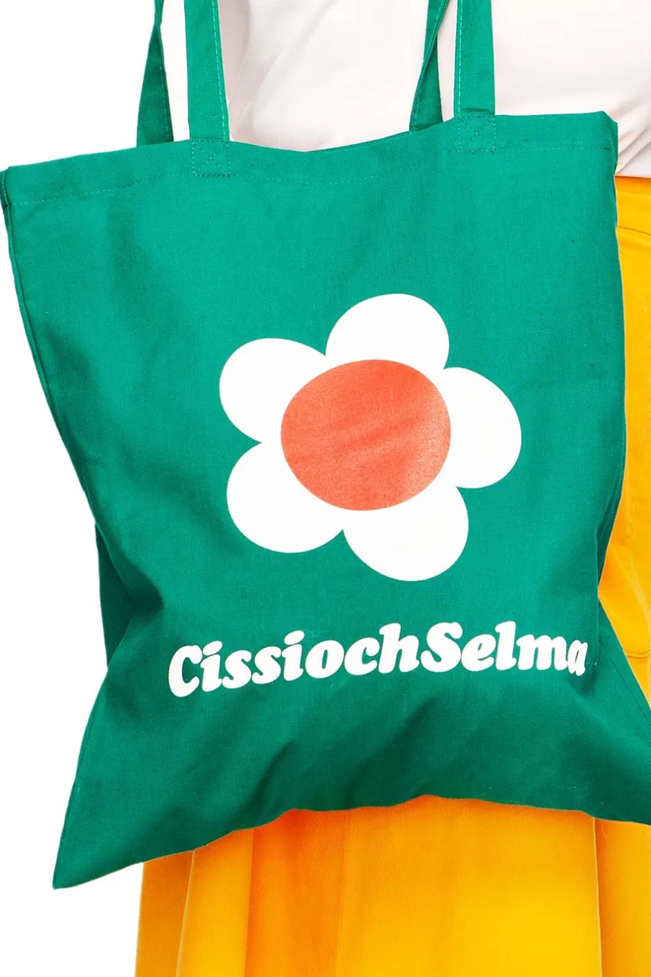 Snyggaste tygkassen i mörkgrönt, med Cissi och Selmas blom-logga i vitt och mörk orange/röd. En kasse som tål att användas många gånger. Ta med den på shoppingtur, till stranden och till jobbet.