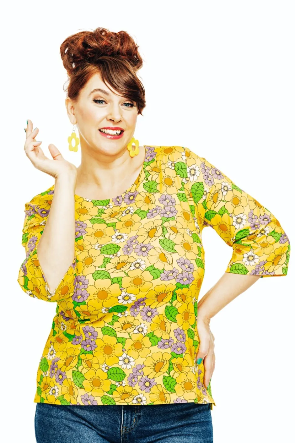 Tyget heter Humlesurr gul. Det här är Cissi och Selmas klassiska blommönster som återkommer varje säsong i olika färgställningar, som denna variant där gult och lila dominerar. Ett blommönster i underbar färgprakt i solgult, grönt och lila.
