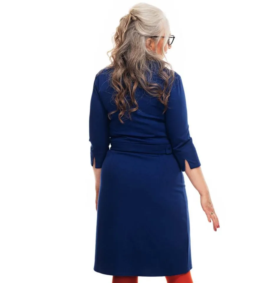 Agneta är en dressad klänning av rakare modell med en liten skorstenskrage, 3/4 ärm med sprund och ett dekorativt skärp. Klänningen har insnitt i ryggen och en kjol som går rakt ner. Tyget är mjukt och följsamt.