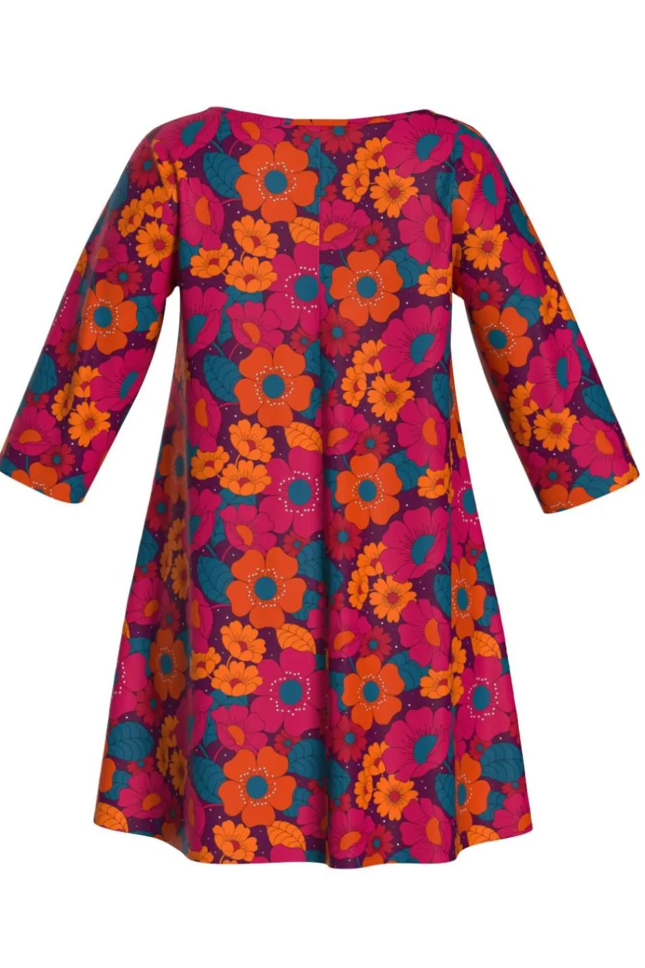 Tyget heter Humlesurr magenta. Det här är Cissi och Selmas klassiska blommönster som återkommer varje säsong i olika färgställningar, som denna variant där orange och magenta dominerar. Ett blommönster i underbar färgprakt i orange, blå och lila/rosa.