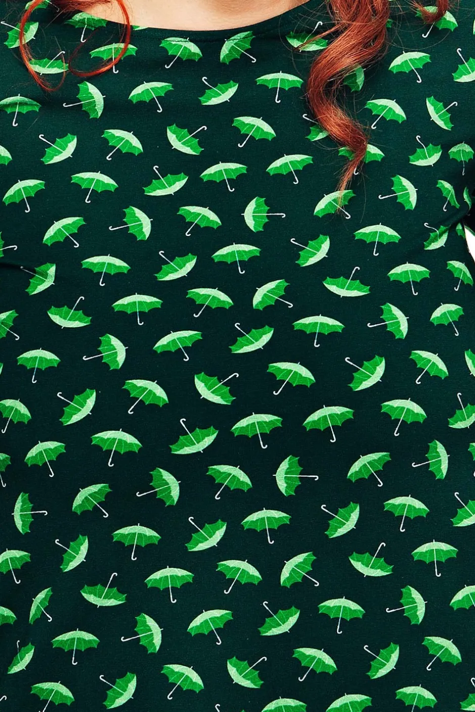 Tyget heter Paraply grön och är ett paraplymönster i färgerna äppelgrön, ljusgrön med detaljer i vitt på en mossgrön bottenfärg.