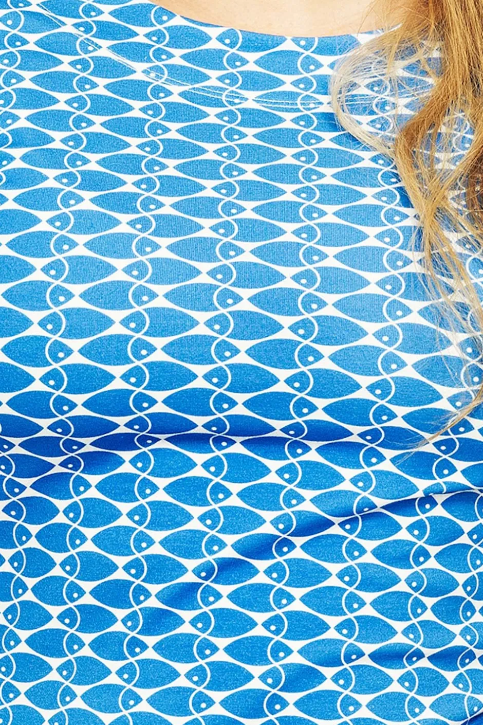 Tyget heter Mört Blå. Ett livfullt mönster där blå fiskar simmar i harmoniska formationer över en krispigt vit botten. Inspirerat av havets djup och sommarens fisketurer skapar mönstret en lekfull och tidlös känsla.