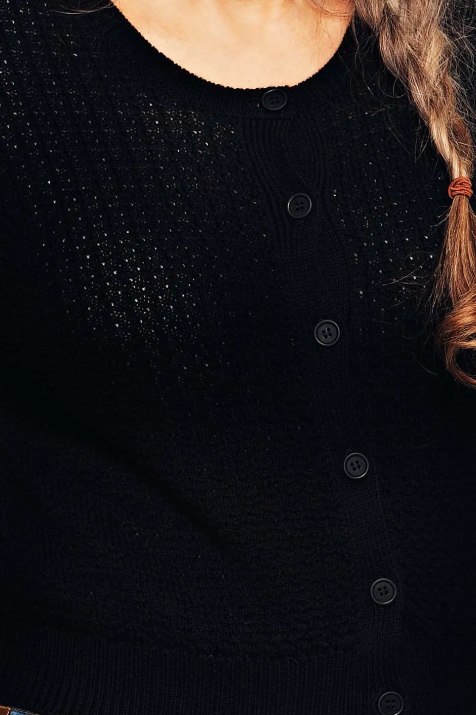 Sigrid är vår populära stickade kofta. Koftan har rund halsringning, lång ärm och knappar fram. Längden är ungefär till höften. Den passar både till klänning och byxor och är mjuk och skön med lite struktur i stickningen. Färgerna är utvalda för att passa till våra mönstrade tyger.