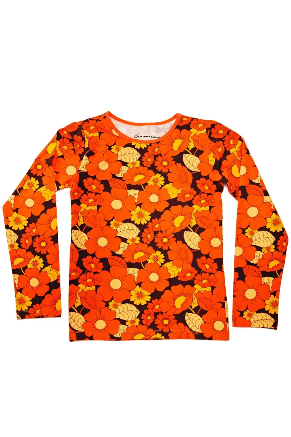 Tyget heter 1970 Orange. Ett blommönster i stora och små blommor och blad. Färgerna är inspirerade av 70-talet och går i olika orange och gula toner på en mörkbrun botten.