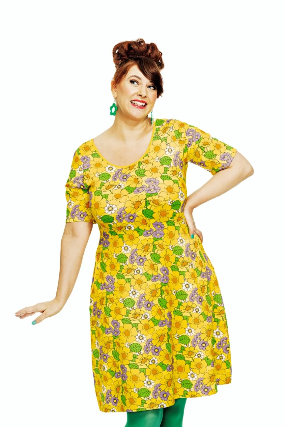 Tyget heter Humlesurr gul. Det här är Cissi och Selmas klassiska blommönster som återkommer varje säsong i olika färgställningar, som denna variant där gult och lila dominerar. Ett blommönster i underbar färgprakt i solgult, grönt och lila.