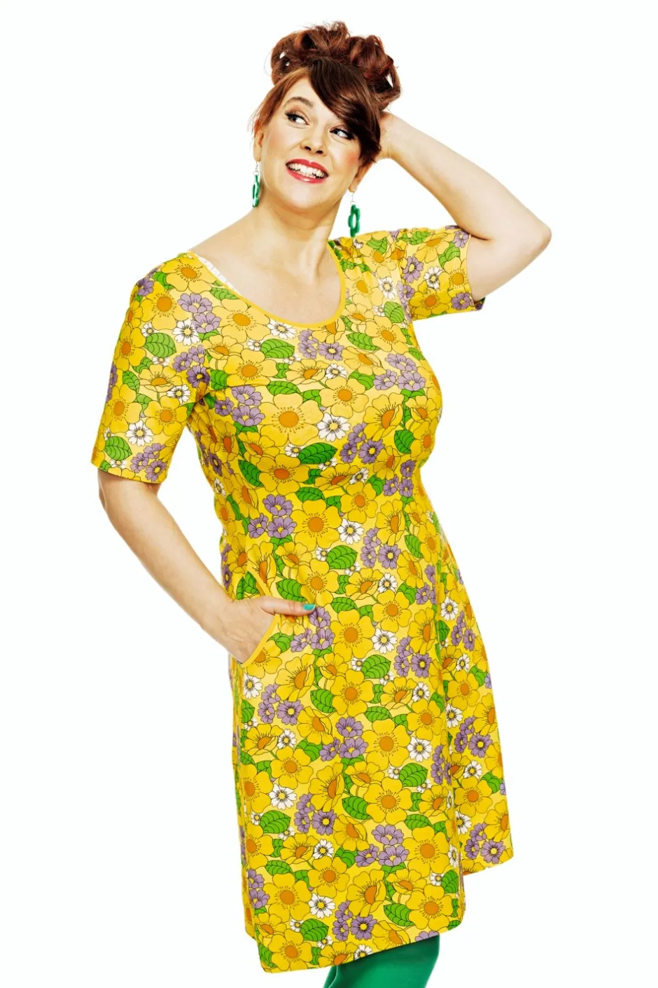 Magda är en trikåklänning utan skärningar med lite vidd i kjolen och perfekt ärmlängd. Klänningen har en elegant halsringning och fickor i sidorna med kontrasterande kantband.