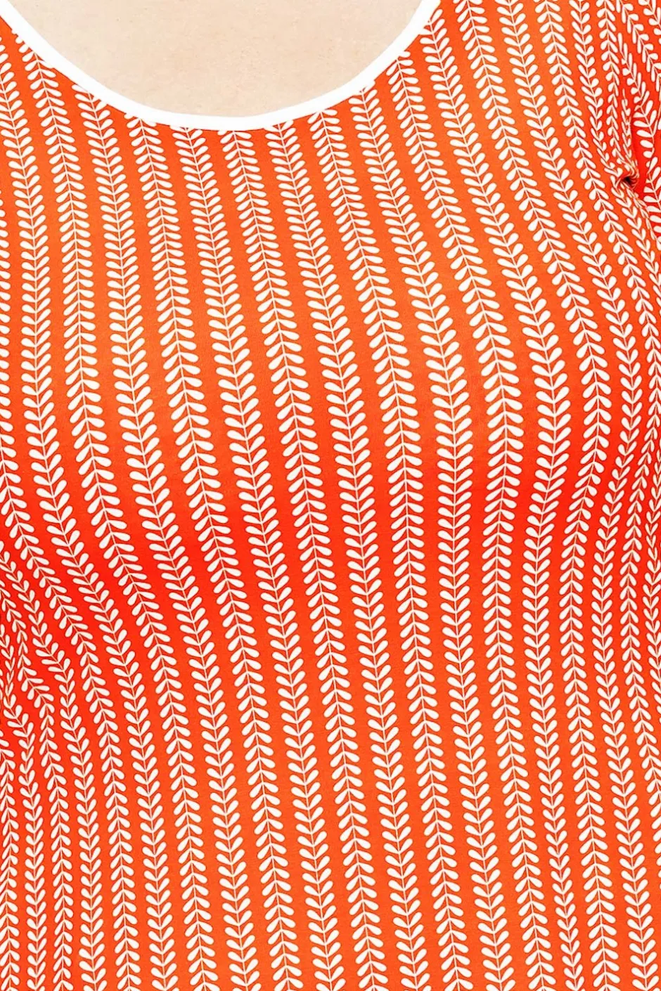 Tyget Ranka är inspirerat av sommarängar och vajande grässtrån. Mönstret har en krämvit design mot en röd/orange botten.