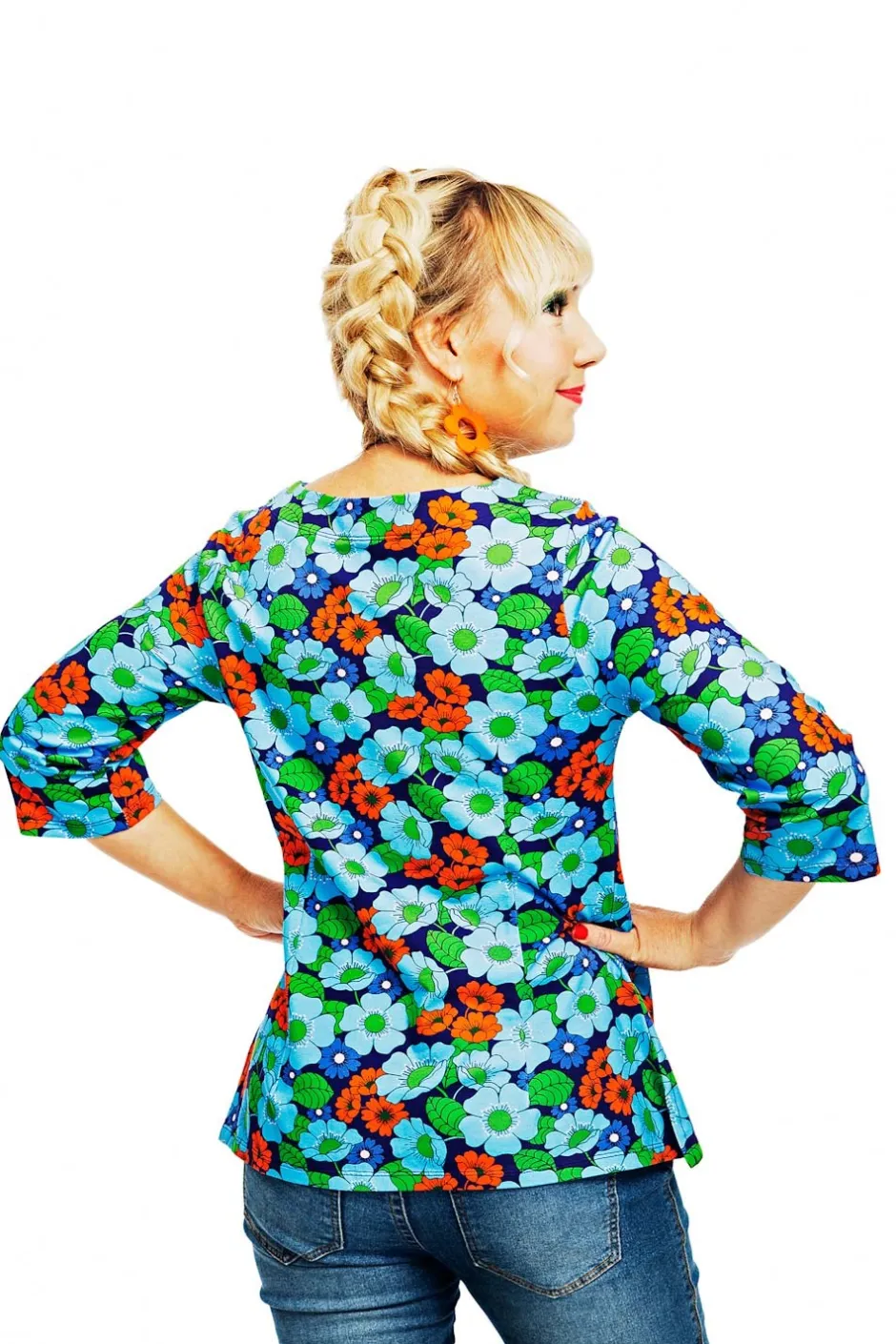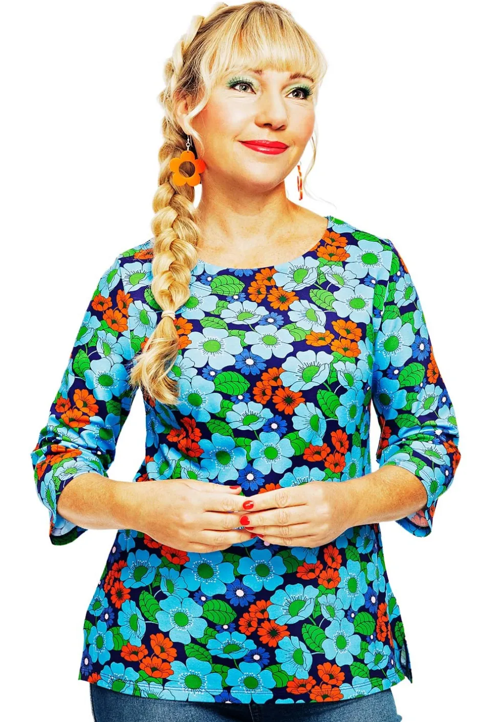 Tyget heter Humlesurr Blå. Det här är Cissi och Selmas klassiska blommönster som återkommer varje säsong i olika färgställningar, här i varianten i blått, orange och grönt. Ett blommönster i underbar färgprakt i mörkblått, ljusblått grönt och orange.