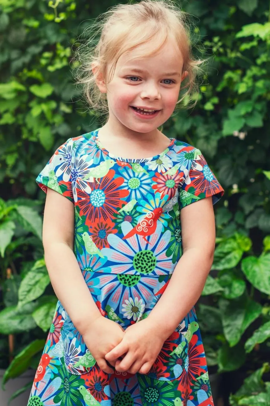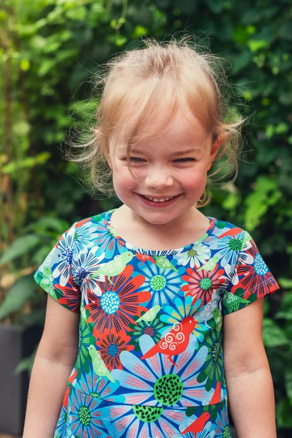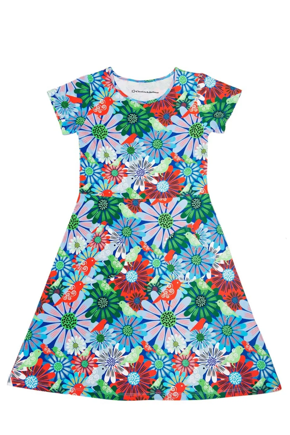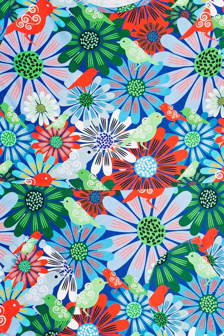 Tyget heter Fågeltivoli och har en ljusblå botten med ett blommönster i grönt, vitt, rött och blått med små fåglar.