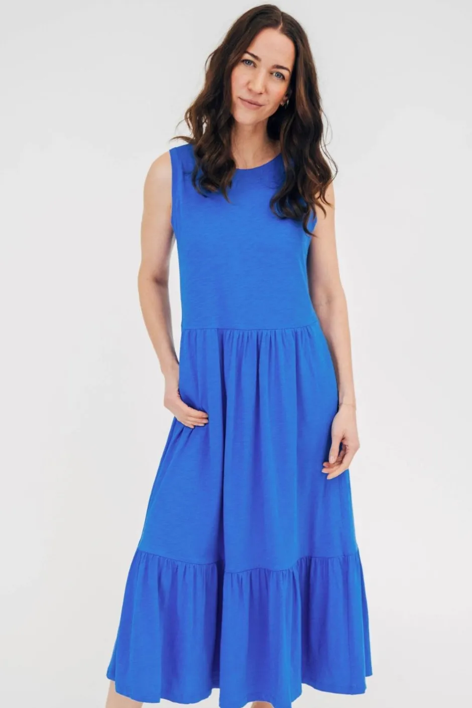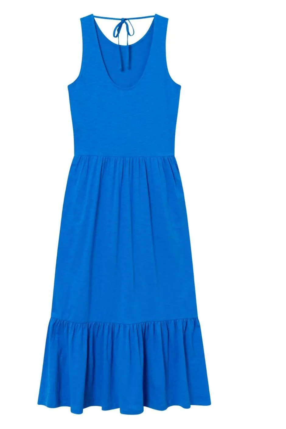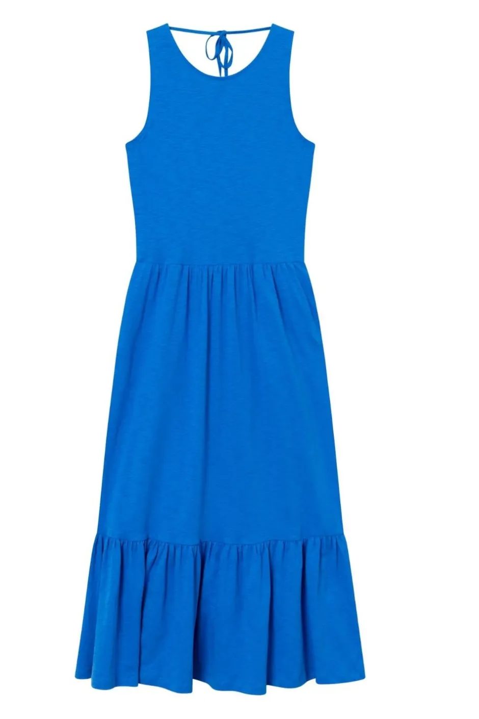 Lång sommarklänning med volanger som gör klänningen extra luftig och skön. Klänningen har en skräddarsydd passform som ändå erbjuder en bekväm och ledig känsla. Utan ärmar och med en låg ryggringning är den perfekt för varma dagar. Klänningen har självklart praktiska sidfickor och den passar perfekt med en kofta eller jacka över när det blir lite kyligt.