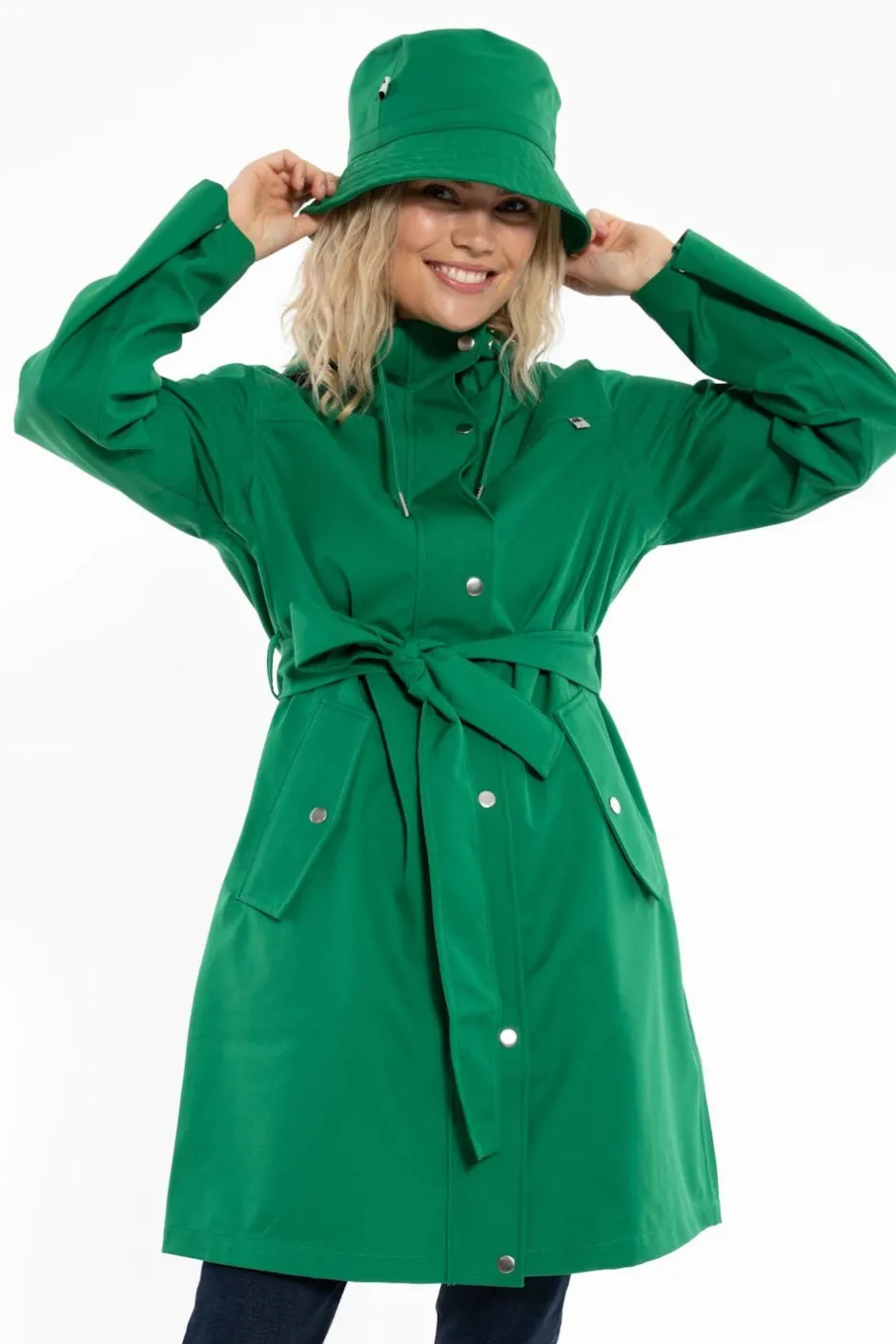 Regnjacka i grönt från danska märket Danefae i en klassisk enkel design. Jackan är av vind- och vattentätt material som släpper igenom luft (10.000 mm). Alla sömmar är tejpade. Funktionella detaljer såsom huva med dragsko, snedställda fickor med lock som stängs med knapp. Jackan har dolt blixtlås, som kan öppnas från båda håll, vilket är väldigt praktiskt för den som rör på sig mycket och t.ex. cyklar. Tillhörande band medföljer att knyta i midjan.