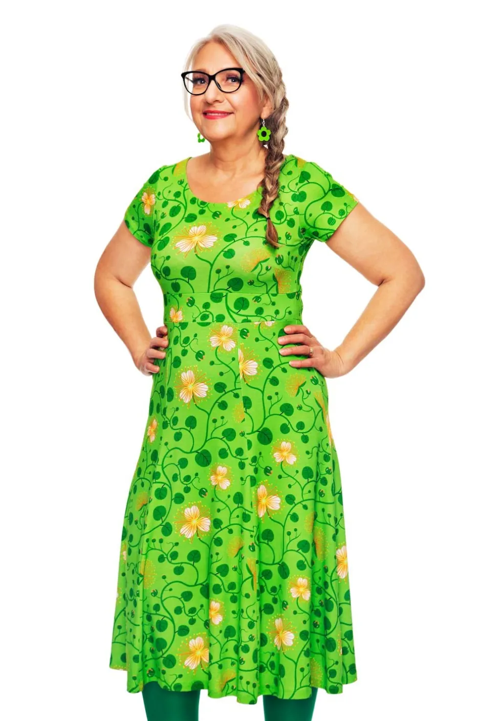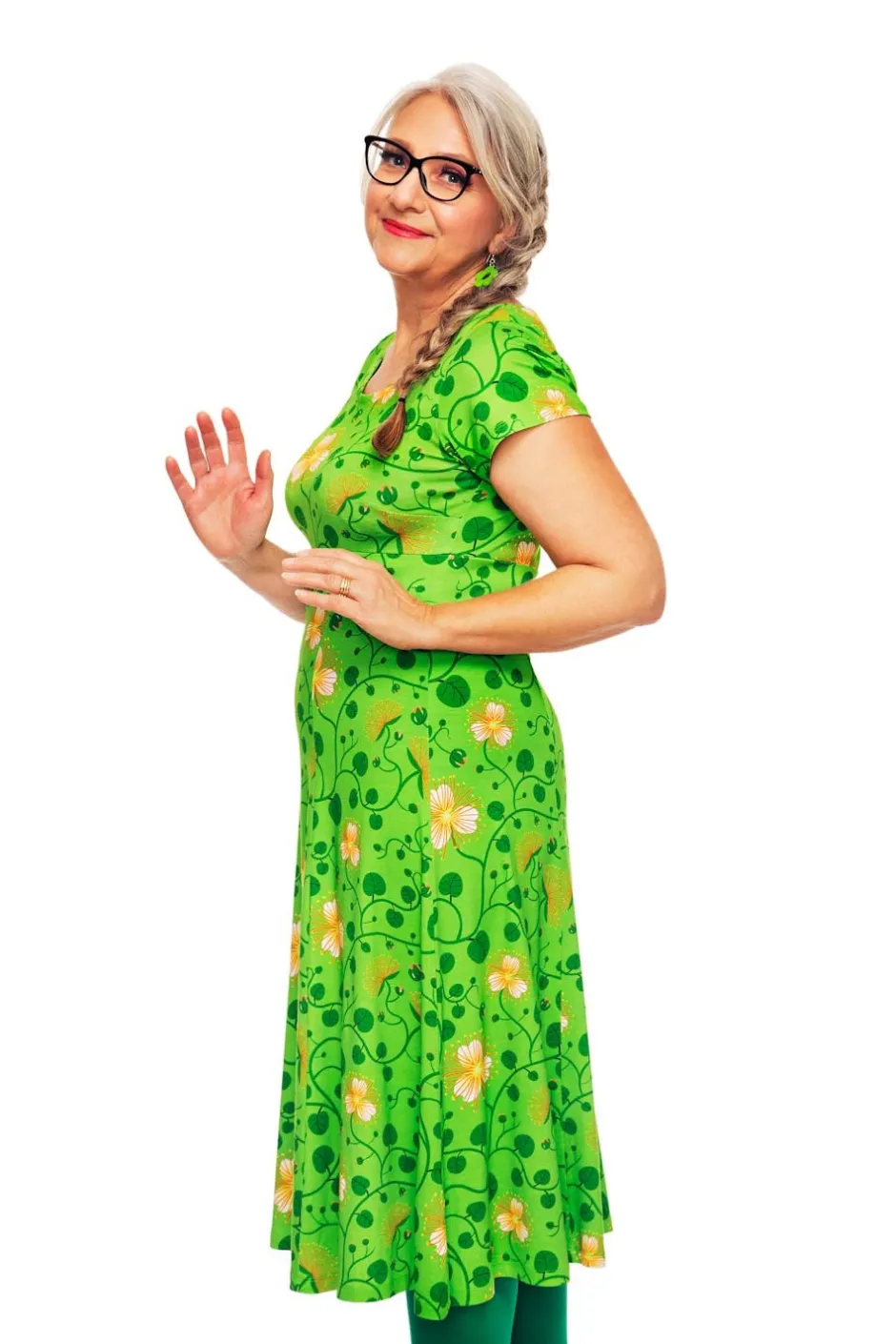 Hedvig är en bekväm sommarklänning i mjuk och stretchig viskostrikå med kort ärm. Klänningen är skuren under bysten med ett litet midjeparti som ger en smickrande skärning. Kjolen är tårtbitsskuren som ger klänningen ett fint fall och vidd.
