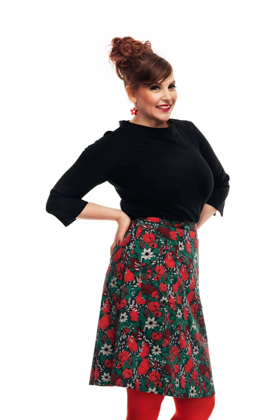 Sonja är en utställd kjol från Cissi och Selma. Kjolen har linning upptill samt stora synliga fickor fram. Kjolen är fodrad så att den inte hänger upp sig på strumpbyxorna och är lätt att komma i och ur med dragkedja bak. Tyget heter Symfoni och har en grön bakgrund med blommor och blad i röd och vit.