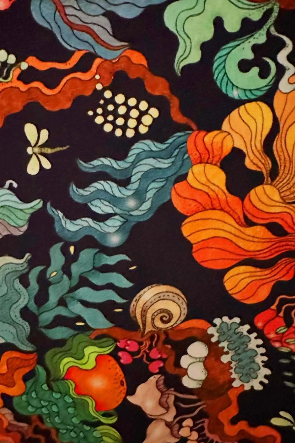 Tyget heter Evighet Blå och har en mörkblå bakgrund med fantasifullt mönster i flera färger. Det är ett mjukt och stretchigt tyg i trikå som passar att sy klänningar, toppar, barnkläder mm.