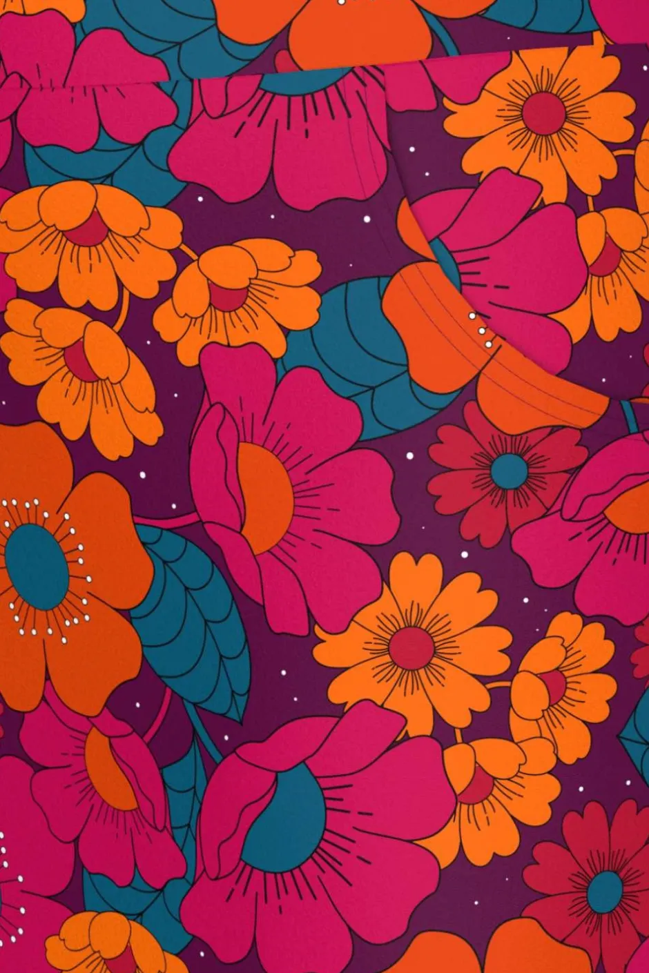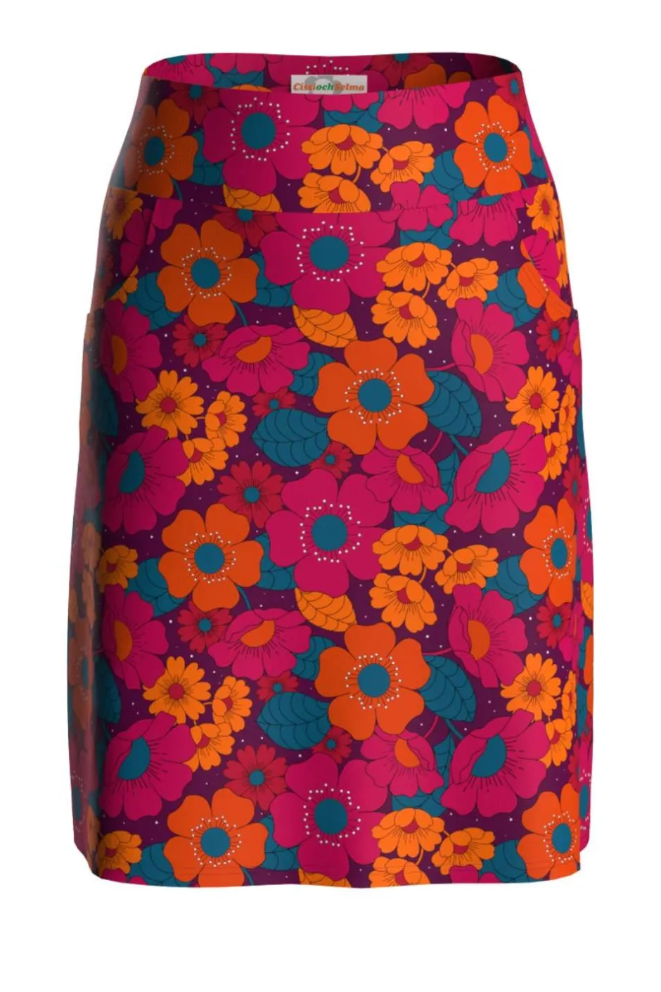 Tyget heter Humlesurr magenta. Det här är Cissi och Selmas klassiska blommönster som återkommer varje säsong i olika färgställningar, som denna variant där orange och magenta dominerar. Ett blommönster i underbar färgprakt i orange, blå och lila/rosa.