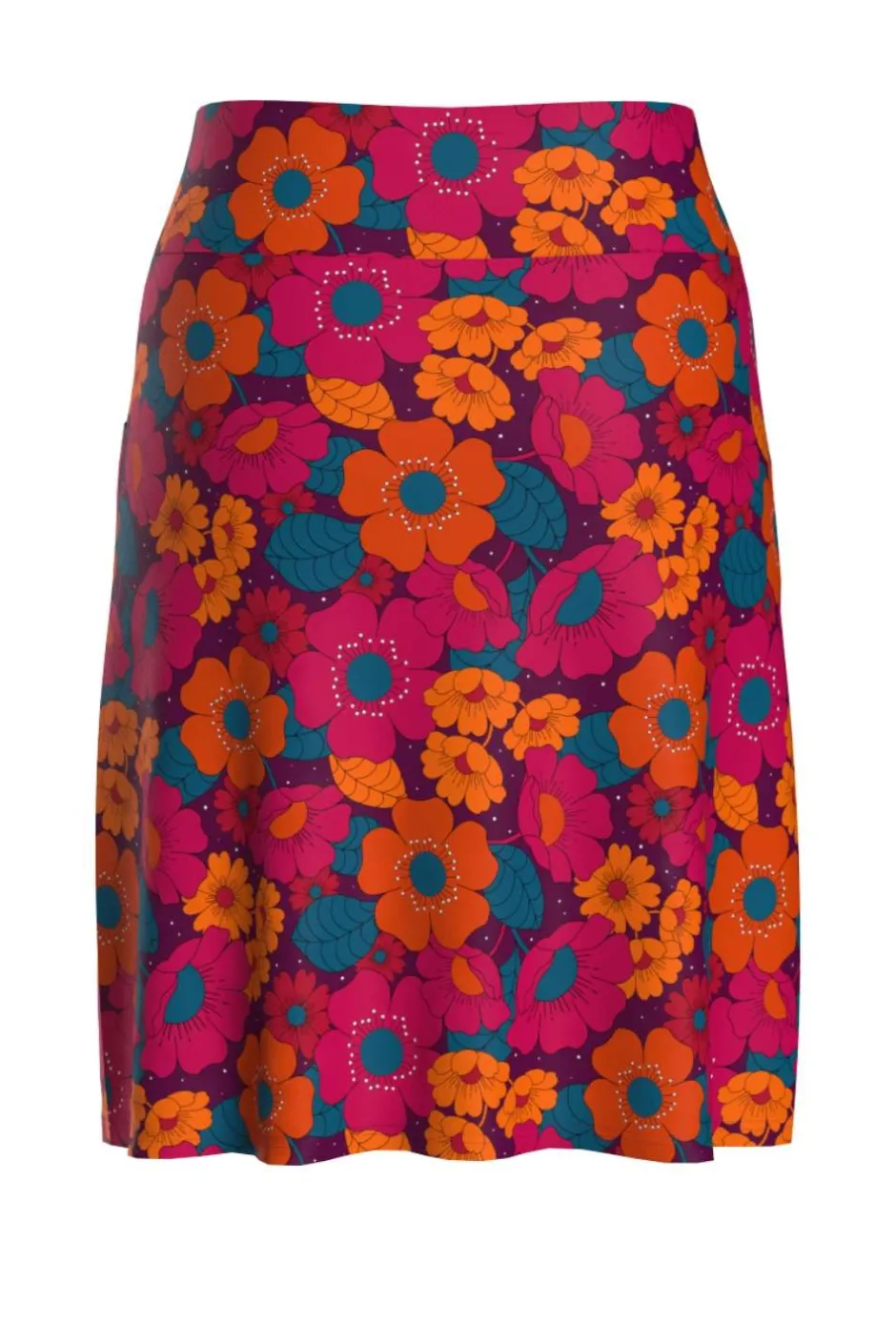 Majken är en bekväm kjol i ekologisk bomullstrikå med figurnära passform. Kjolen har fickor och bred mudd i midjan. Längden är till strax ovanför knät.