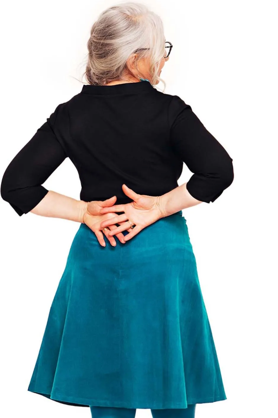 Sonja är en utställd kjol från Cissi och Selma i vävt bomullstyg. Kjolen har linning upptill samt stora synliga fickor fram. Kjolen är fodrad så att den inte hänger upp sig på strumpbyxorna och är lätt att komma i och ur med dragkedja mitt bak.