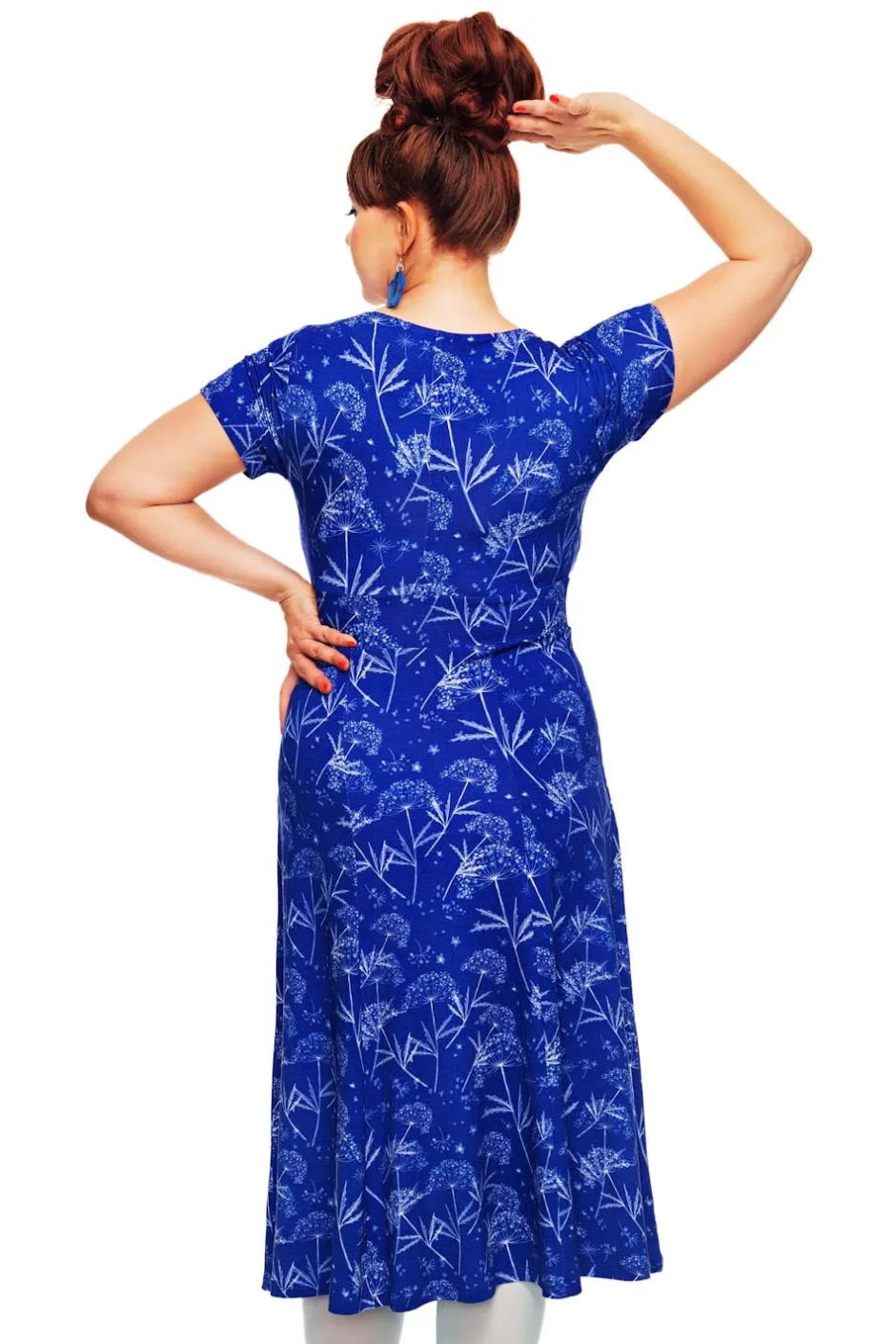 Hedvig är en bekväm sommarklänning i mjuk och stretchig viskostrikå med kort ärm. Klänningen är skuren under bysten med ett litet midjeparti som ger en smickrande skärning. Kjolen är tårtbitsskuren som ger klänningen ett fint fall och vidd.