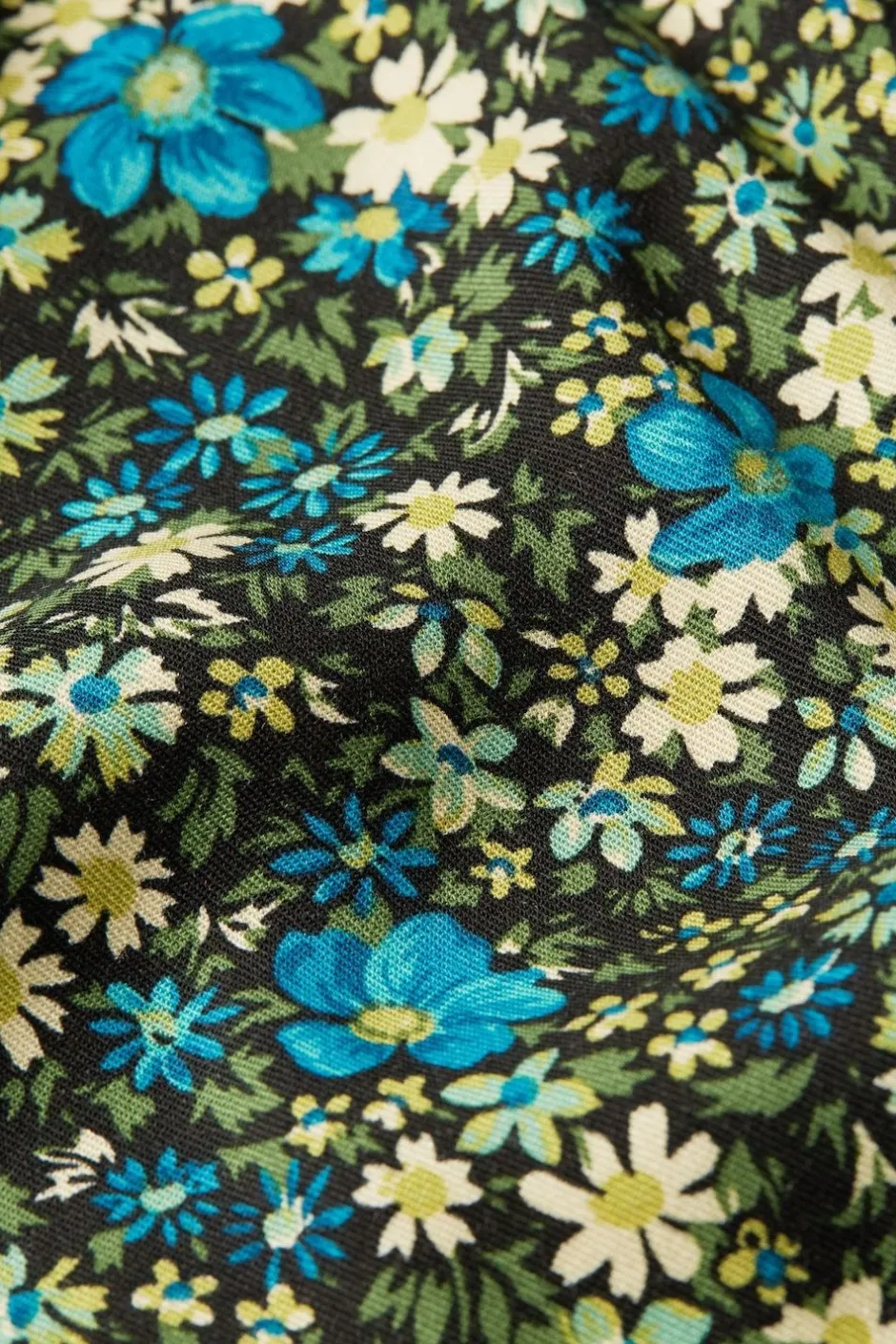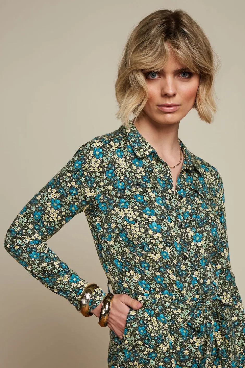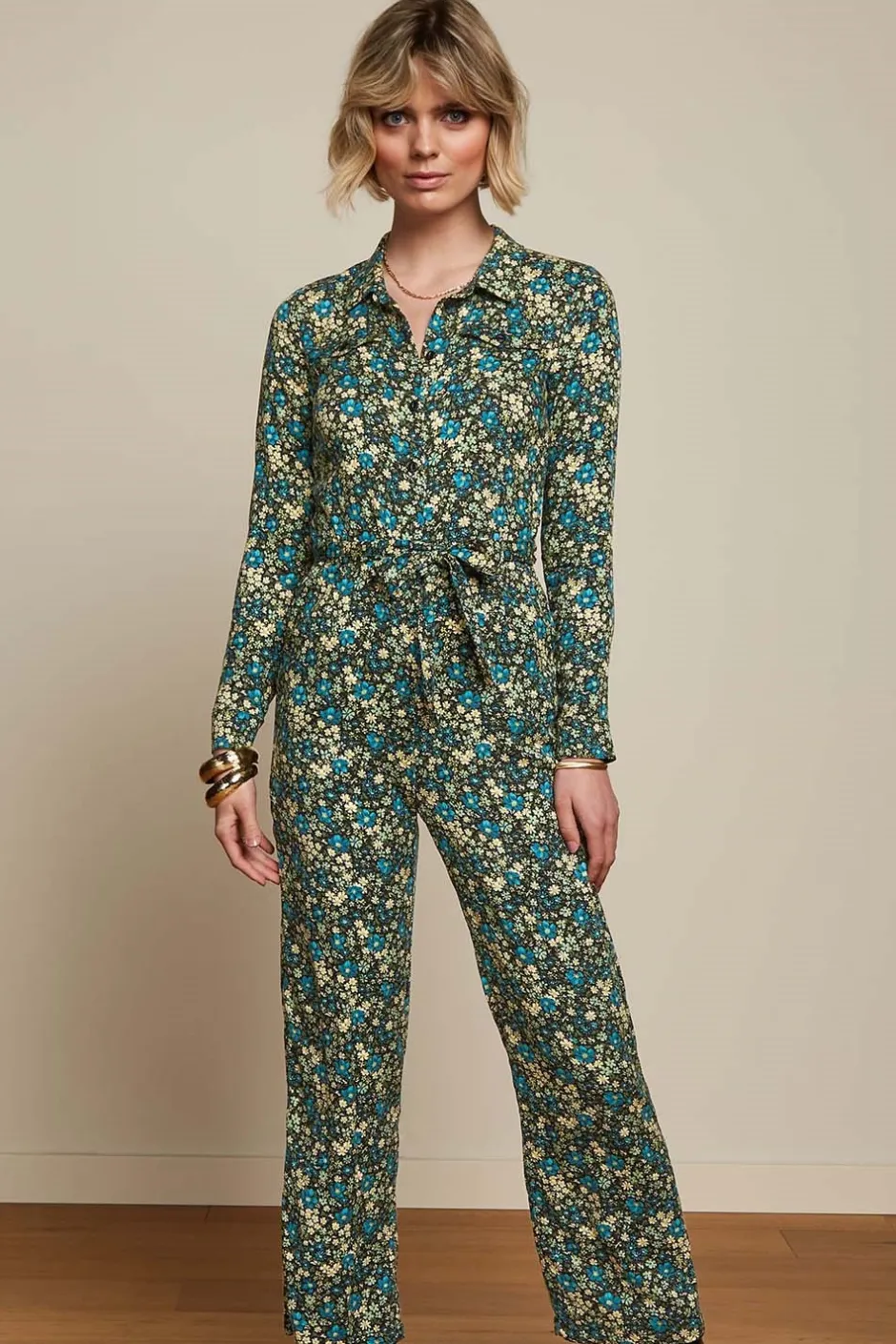 Småblommig byxdress från holländska märket King Louie. Byxdressen är sydd i ett skönt, tunt, vävt viskostyg. Överdelen är en långärmad skjortmodell med krage, knappar och bröstfickor. I ryggen är det ok med väck. Byxdelen har gylf med dragkedja, fickor och raka byxben. Byxdressen har även ett påsytt skärp att knyta i midjan.
