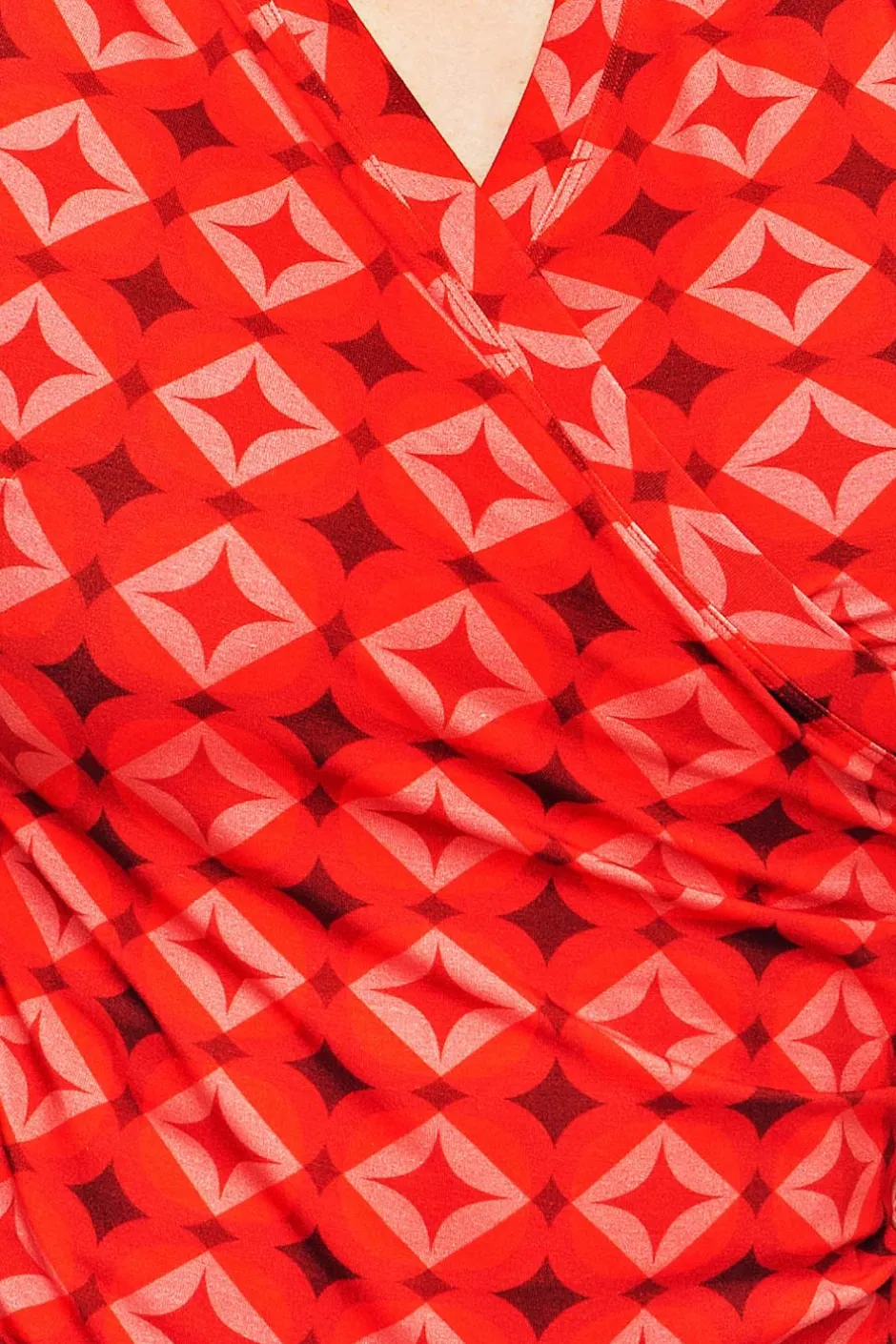 Tyget heter Mosaik Röd. Ett kalejdoskops-inspirerat mönster som går ton i ton i röd-rosa toner.