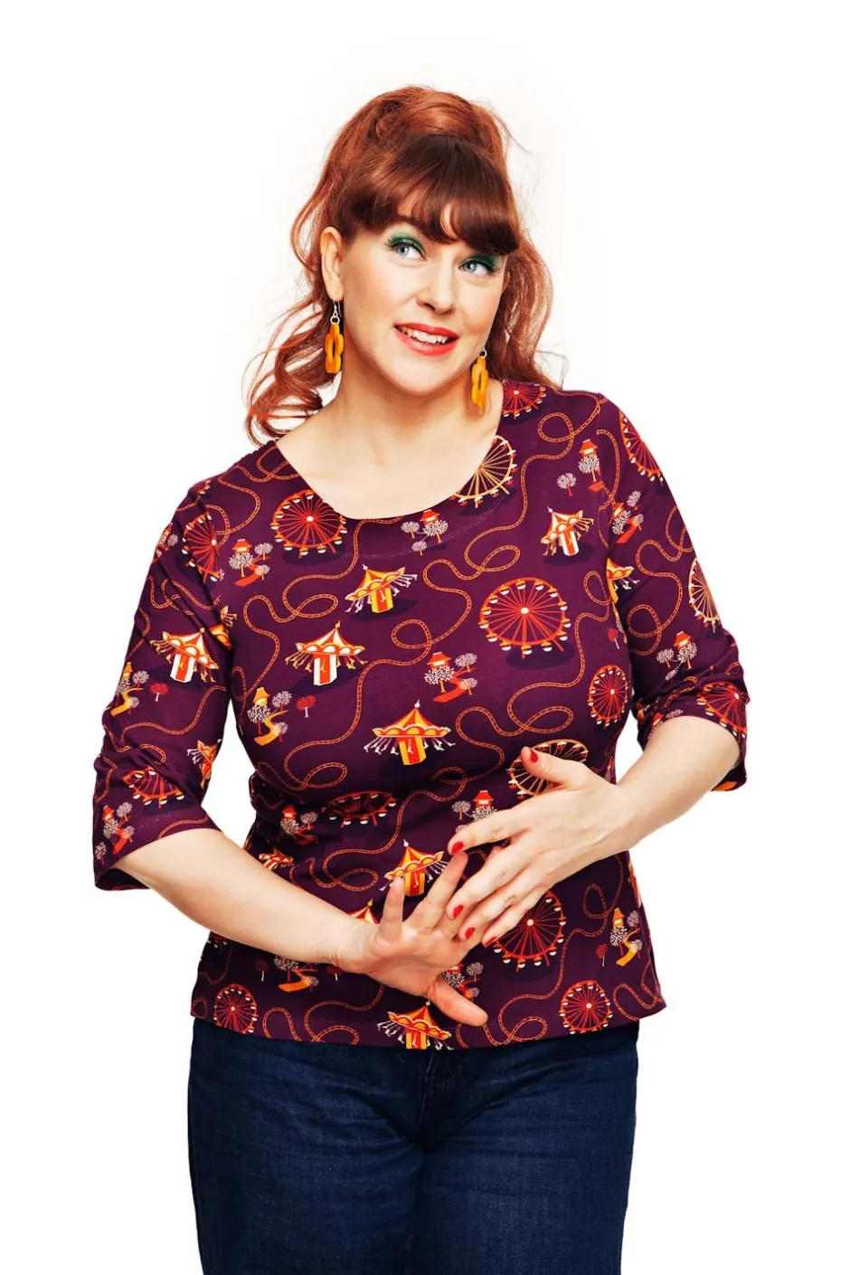Tyget heter Tivoli Plommon och är ritat av Vera Kindgren. Ett glatt mönster med snurrande karuseller och böljande berg-och-dalbanor. Färgerna går i orange och gult på en plommonlila bakgrund.