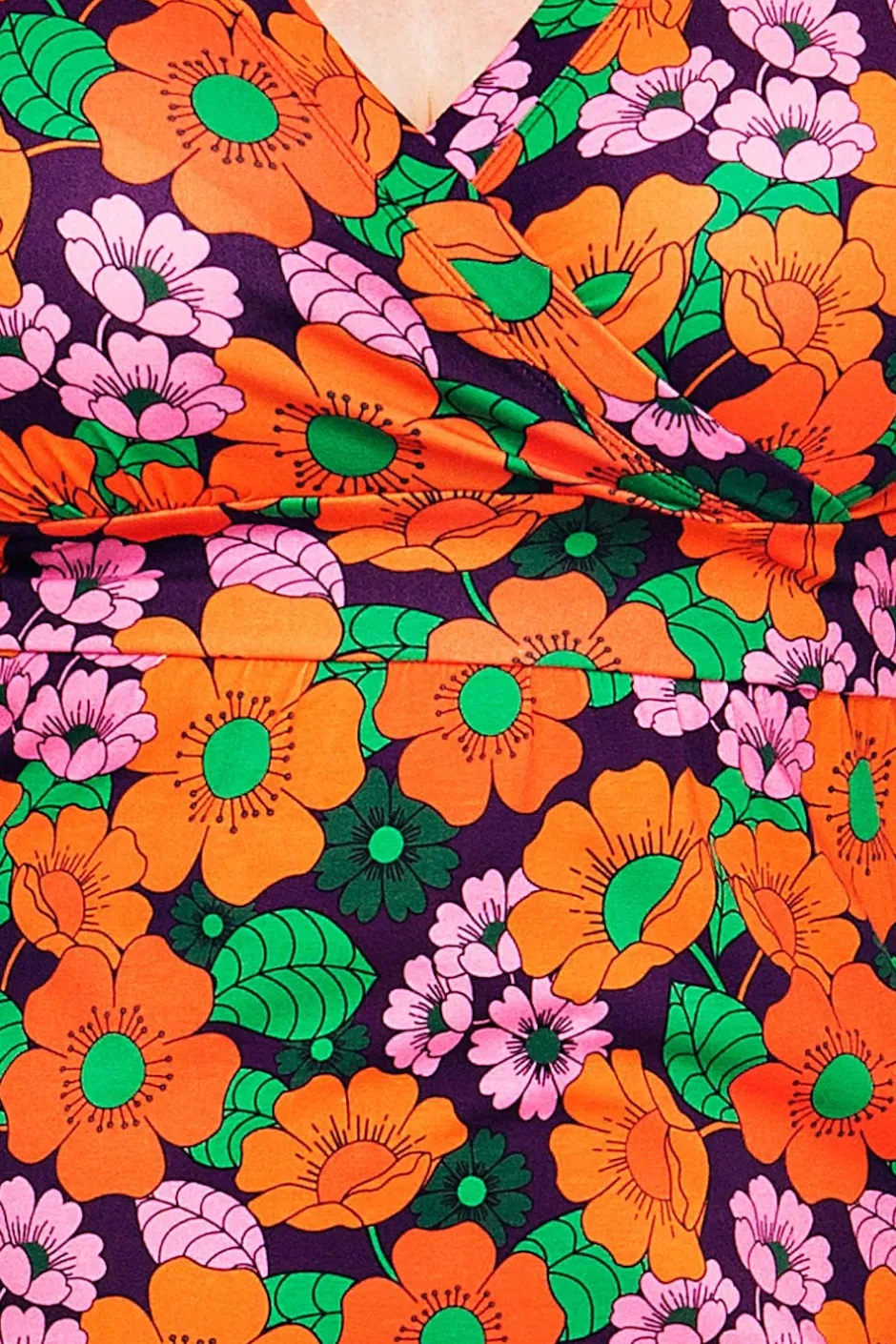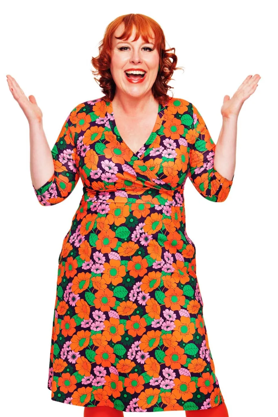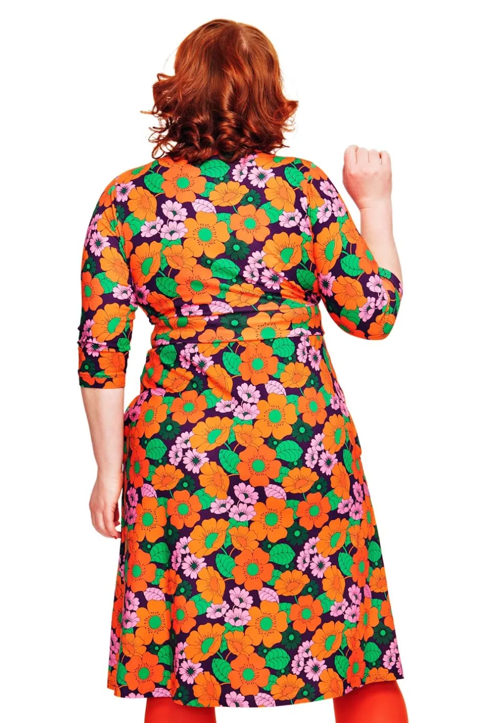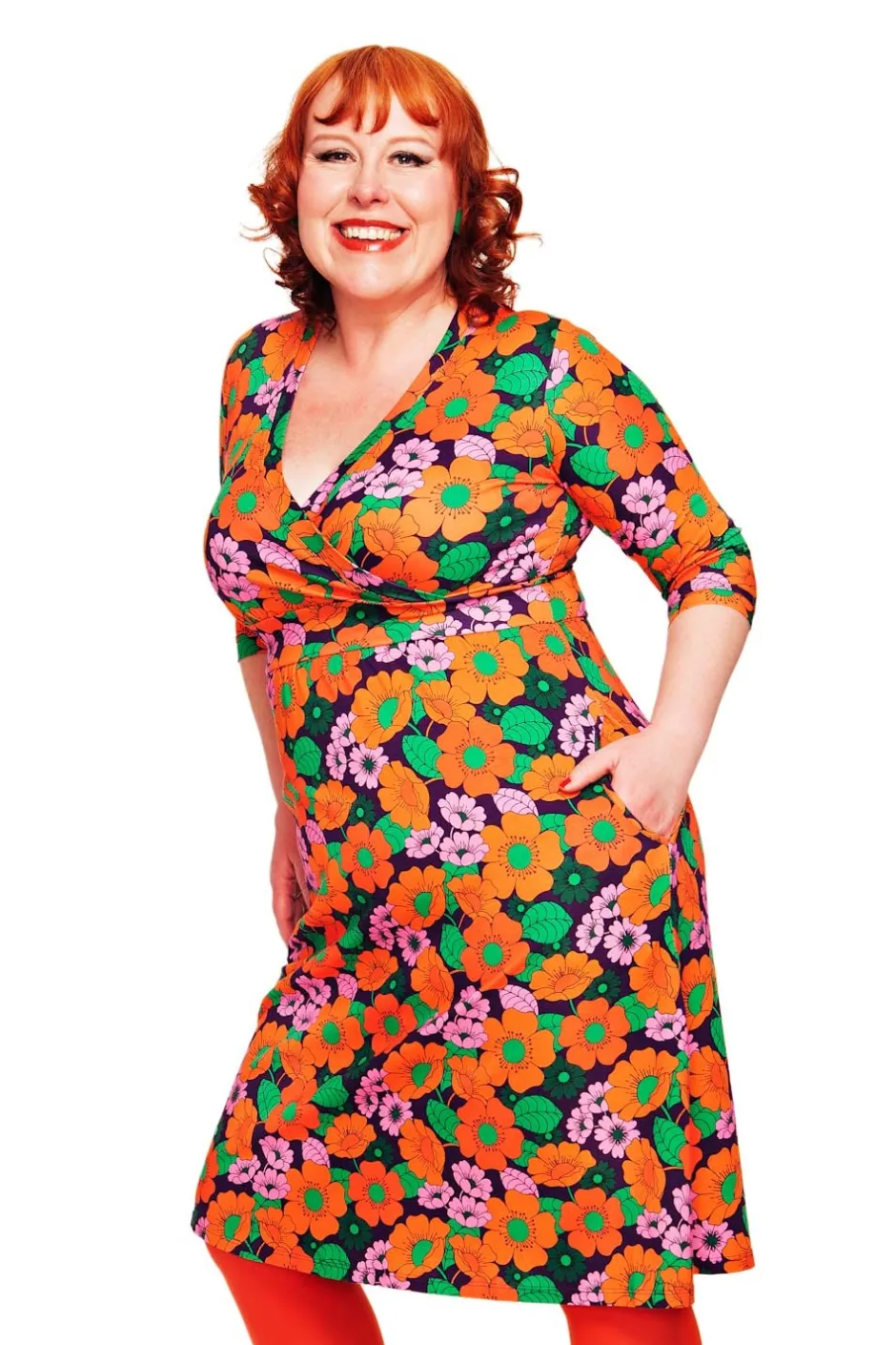 Vera är en välarbetad klänningsmodell med fina detaljer. Den har V-formad omlottringning, ett midjeparti och lätt rynkad kjol med fickor i sidorna. Längden är till nedanför knät och ärmen går till armbågen.