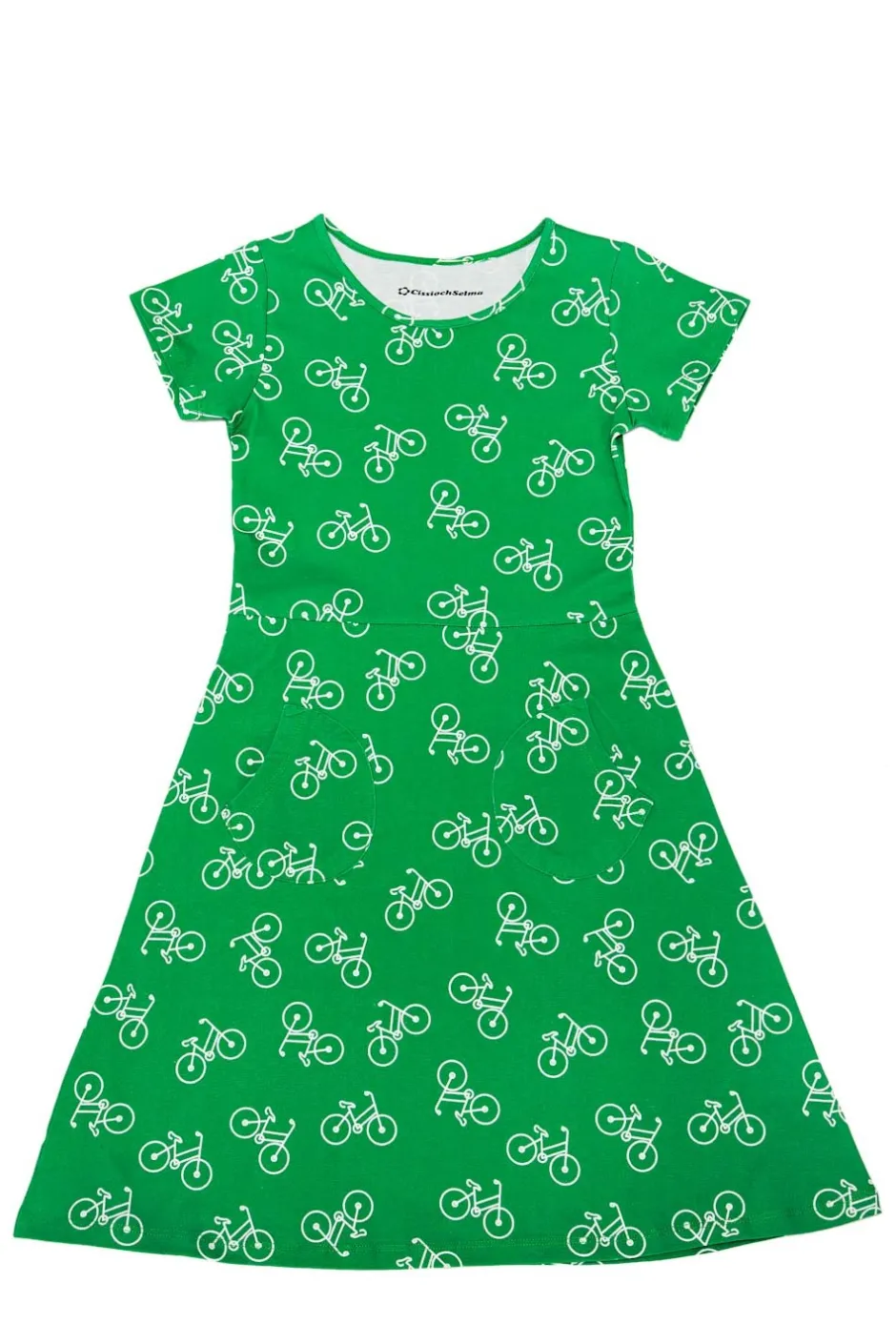 Tyget heter Cykeltur Grön och har en grön bakgrund med vita cyklar.