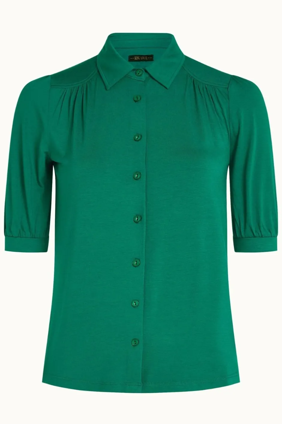 Skjortblus från holländska märket King Louie. Blus med luftig & kort ärm med en liten puff. Blusen är sydd i skön och stretchig viskostrikå. Skjortan har en nätt krage och knäppning hela vägen framtill.