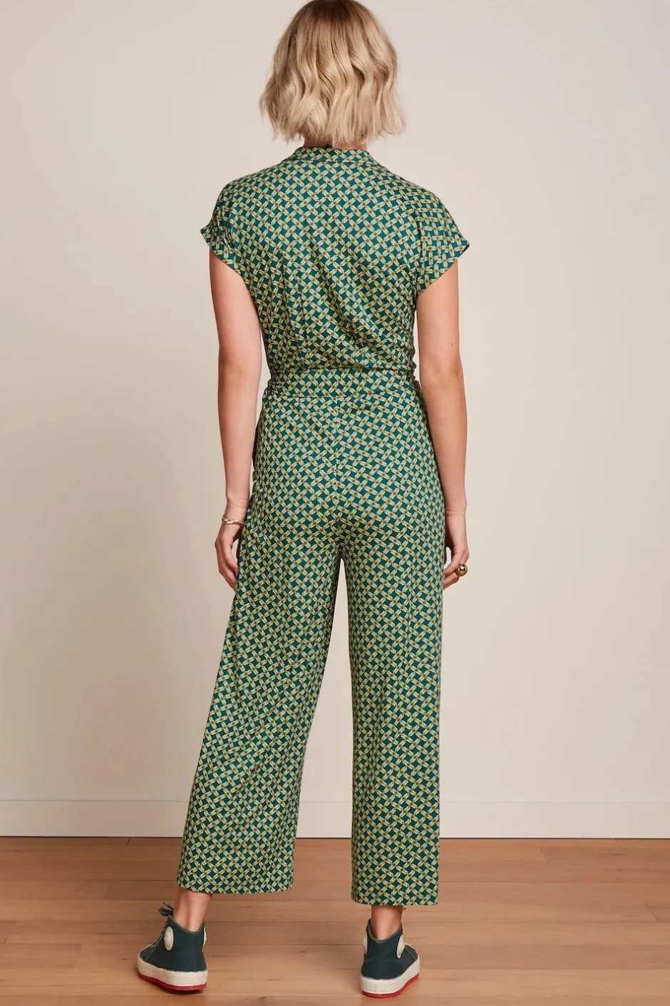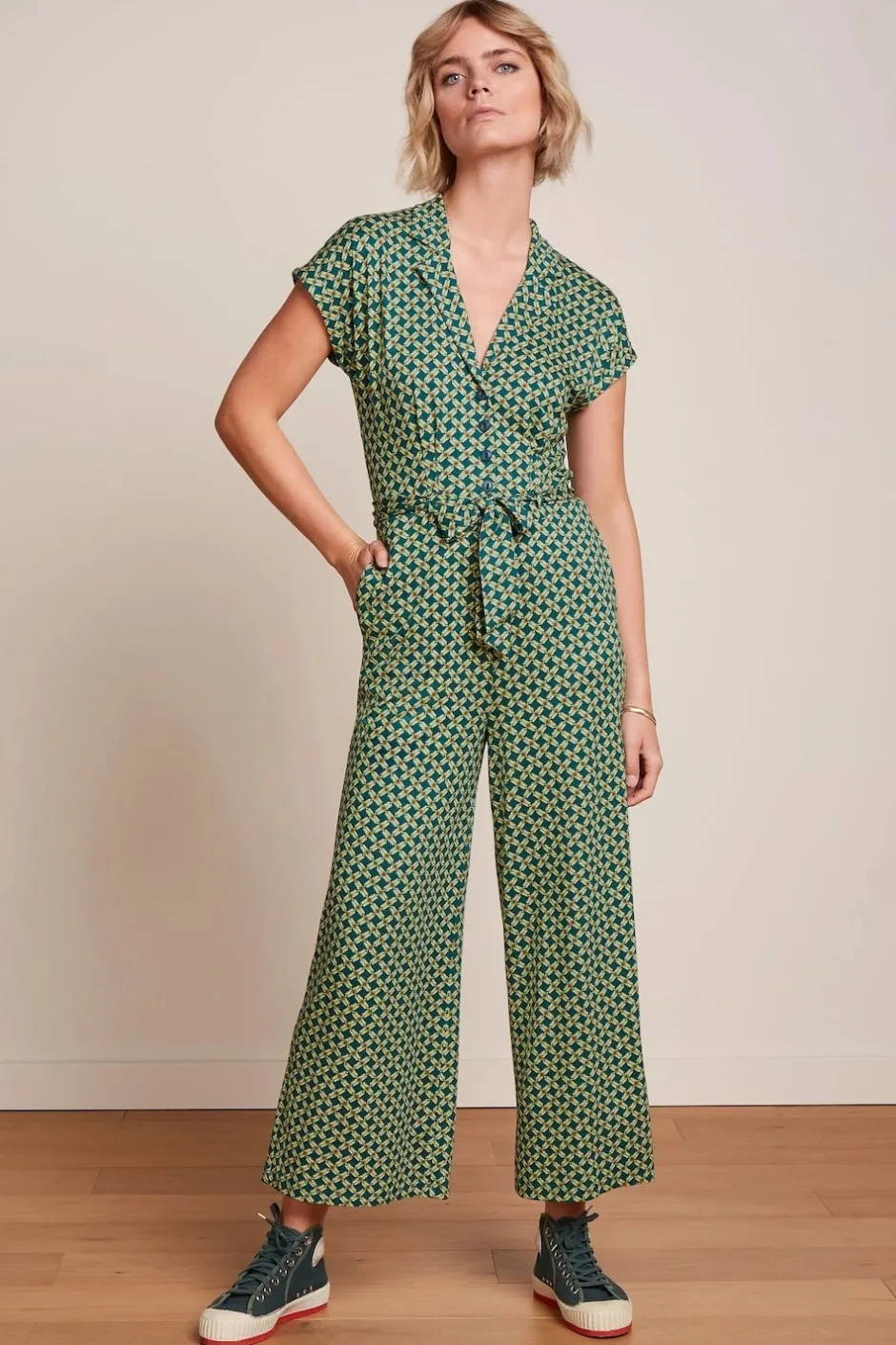 Byxdress i mjuk trikå från holländska märket King Louie. Jumpsuit med knäppning framtill, krage och slag, kortärm med uppvik. Dekorativa veck i midjan, fastsytt knytskärp. Utställda ben. Stretchtyg.