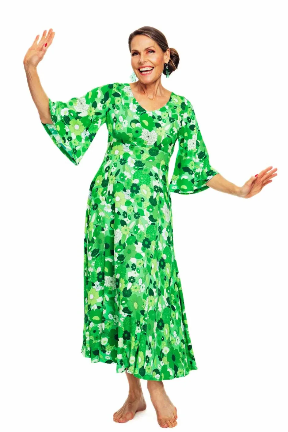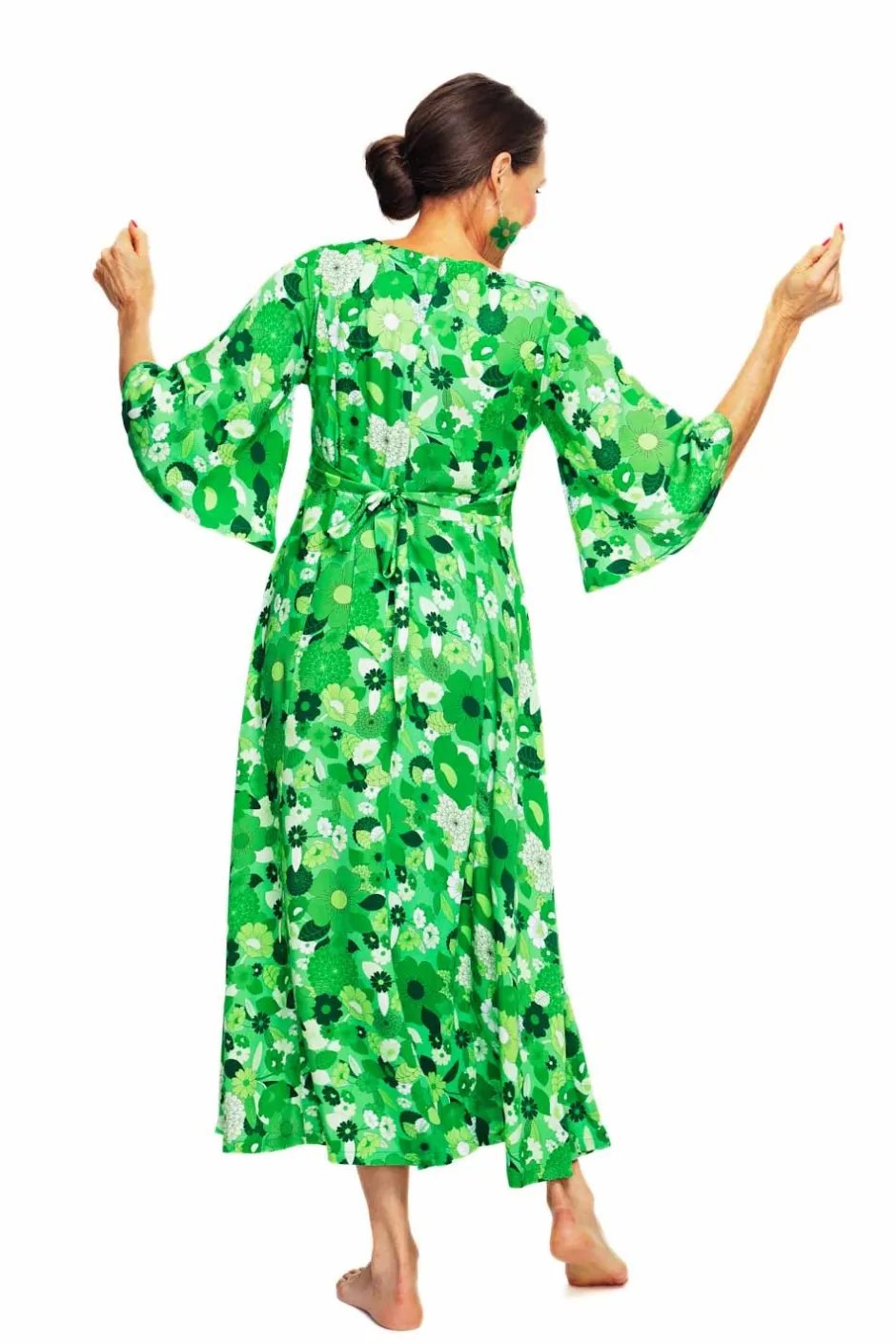 Greta är en elegant och klassisk klänningsmodell i viskos med trumpetärm i 70-talsanda från vår egen Cissi och Selma kollektion. Klänningen har en vacker v-formad ringning, en skärning under bysten med knytband bak i ryggen. Kjolen är tårtbitsskuren och har ett fint fall och vidd. Klänningen är lång men inte hellång så den passar även till den som är lite kortare. En bekväm festklänning eller vardagsklänning att bo i hela sommaren. Tyget heter Fred Grön och är ett härligt somrigt blommönster i gröna och vita nyanser.