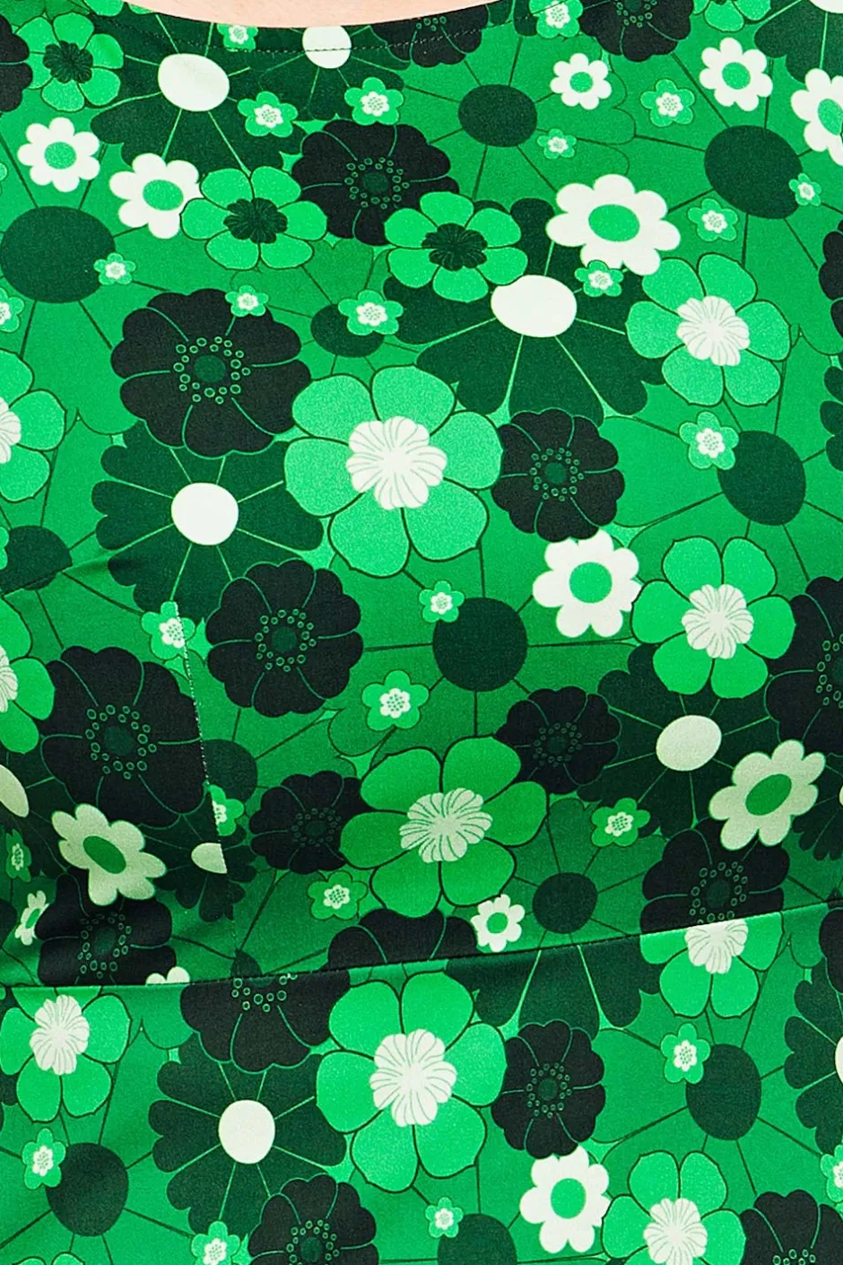 Mönstret heter Perspektiv Grön och är en blinkning till gamla retrotyger i en modernare anda. Ett stilistiskt blommönster i olika gröna toner.