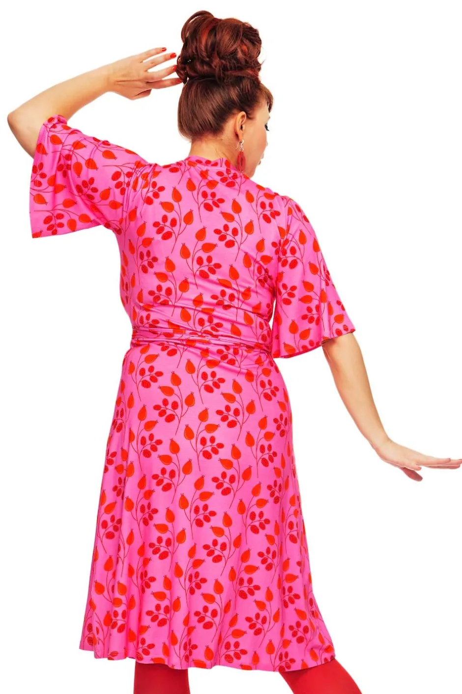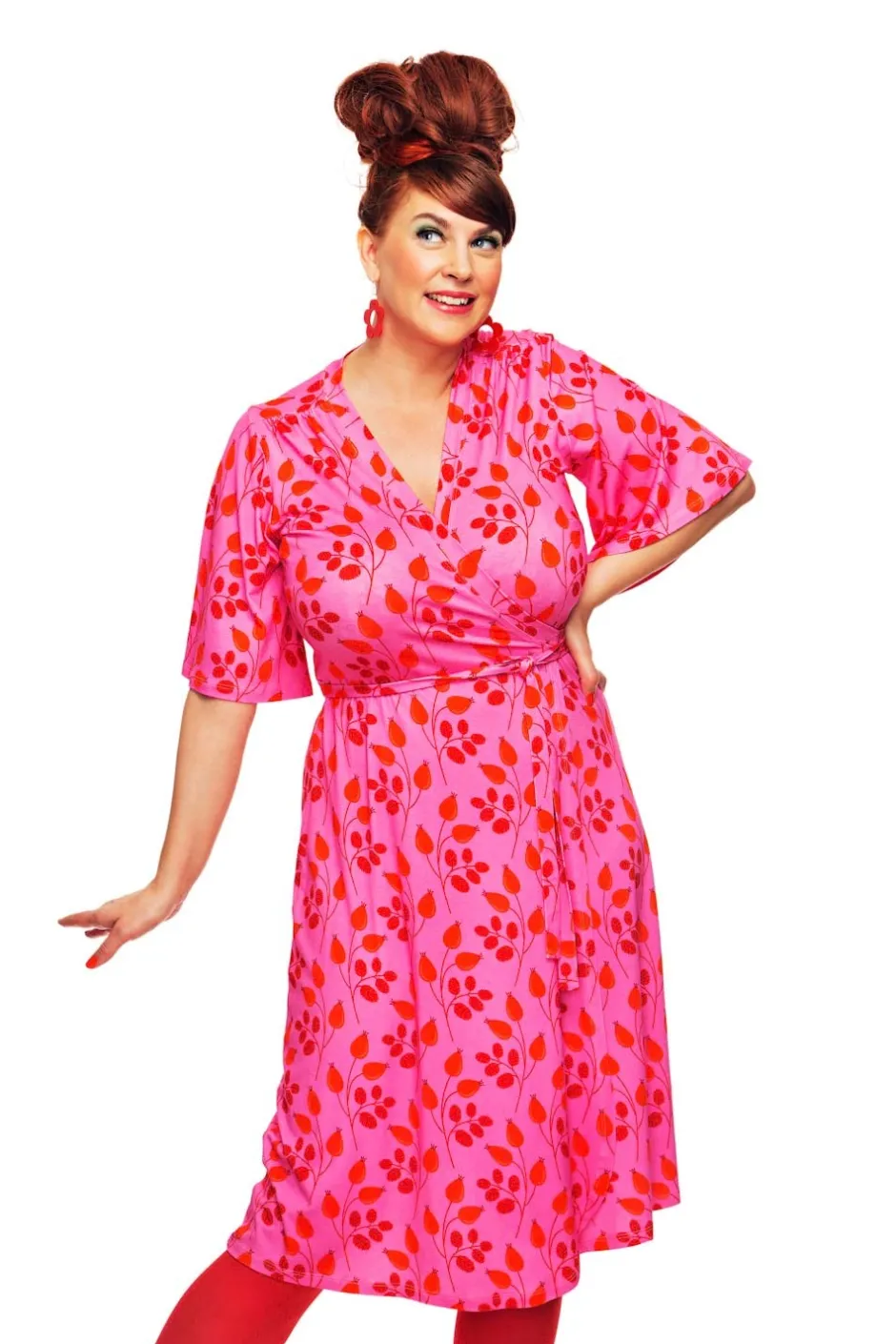 Josefine är en smickrande omlottklänning i mjuk och stretchig visokstrikå med fint fall. Den har knytband i midjan och dekorativa rynkade veck på framsidan av axeln. Klänningen har vackert böljande fjärilsärmar som slutar vid armvecken.
