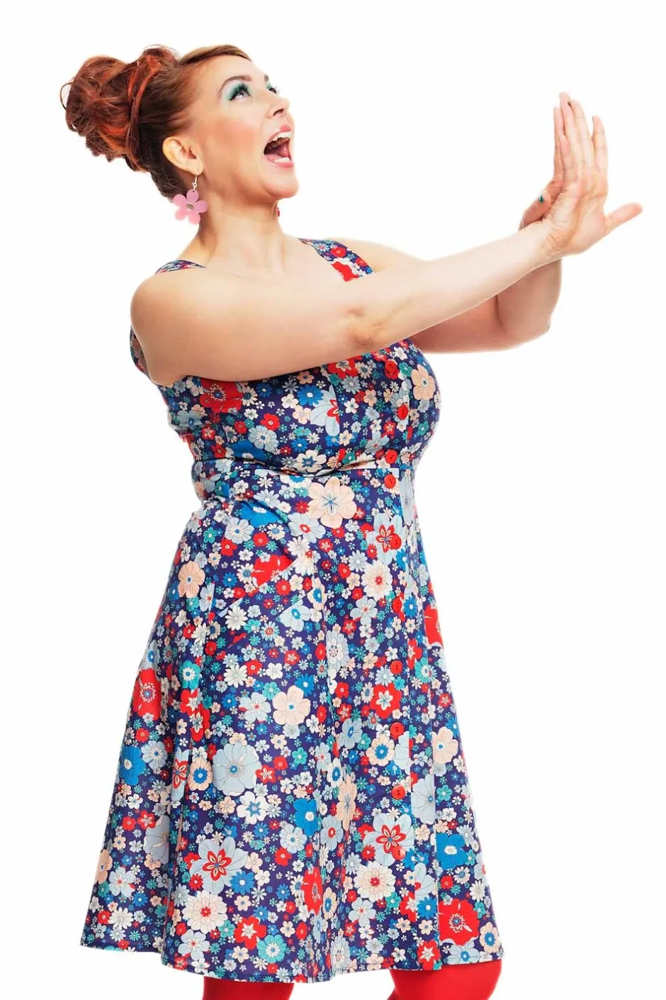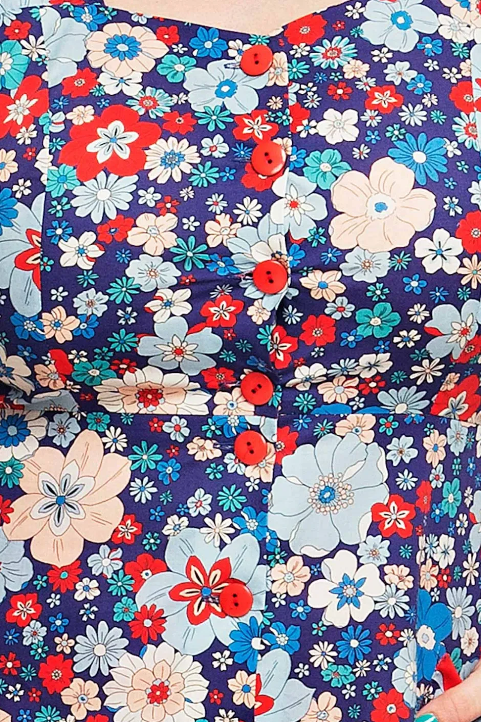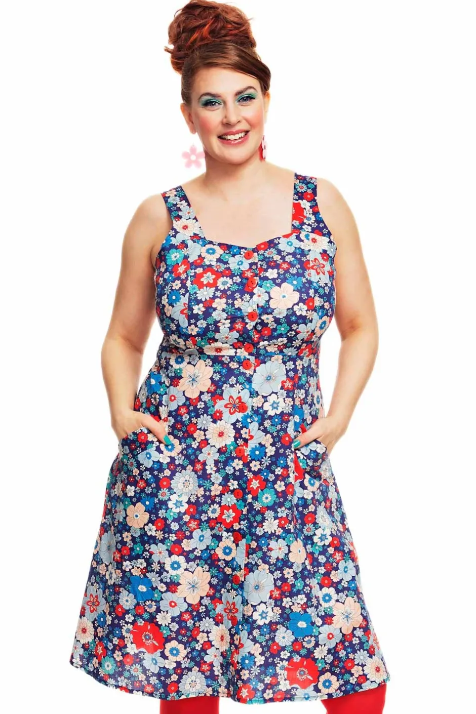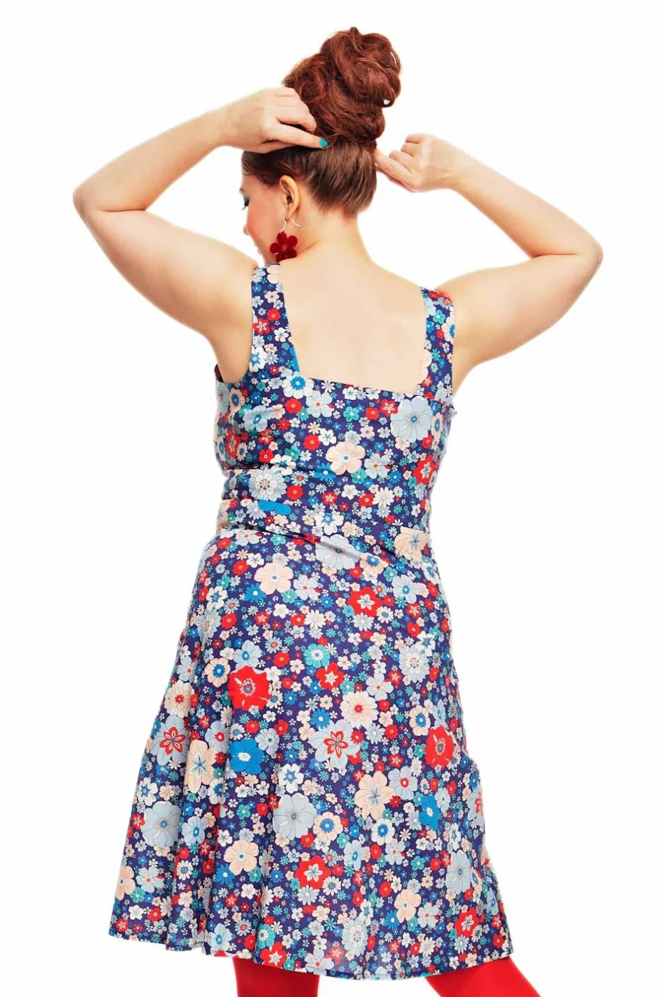 Maja är inspirerad av 50-talets hängselklänningar. Modellen har knappar fram, snedställda fickor och en lätt utställd kjoldel. Prinsesskärningen i livet ger klänningen en bra passform. Klänningen är ärmlös och har öppen rygg vilket gör den till en passande sommarklänning för varma dagar. Tyget heter Kreativ Blå och har stora och små blommor i färgerna röd, vit, ljusblå och rosa på mörkblå botten.