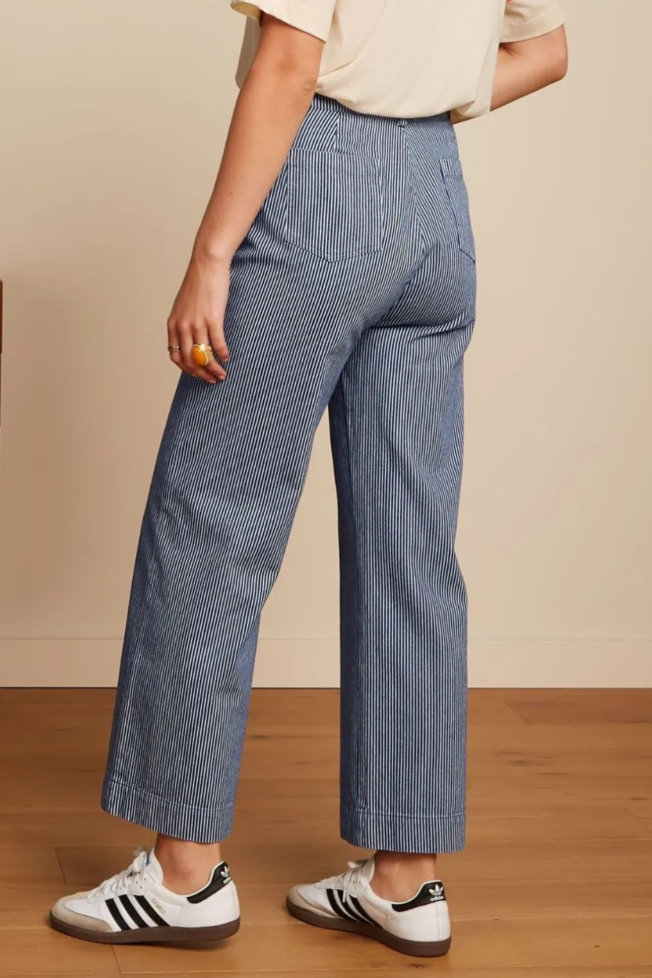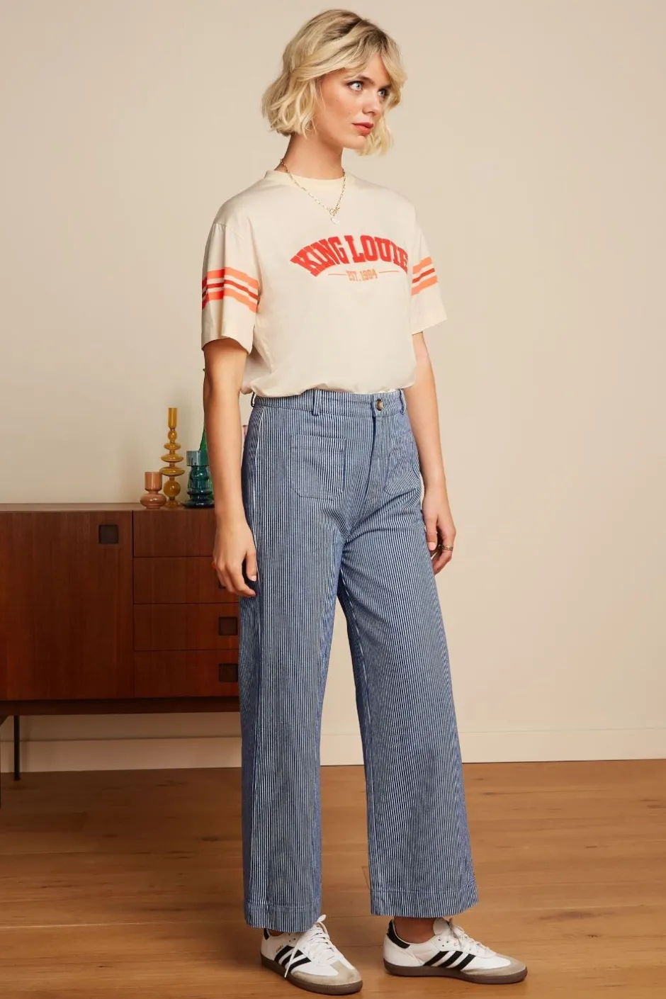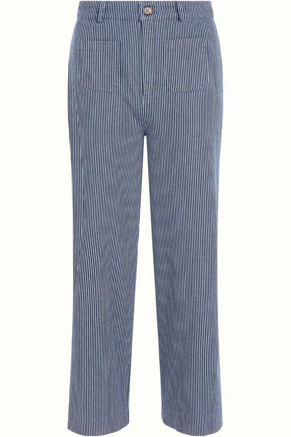 Randiga jeans med hög midja från holländska märket King Louie. Jeansbyxor med knäppning och dragkedja med bälteshällor. Byxorna har två små fickor framtill och utställda ben. Kortare benlängd.