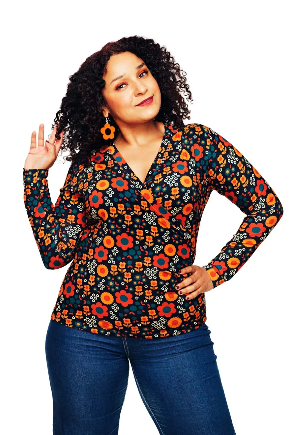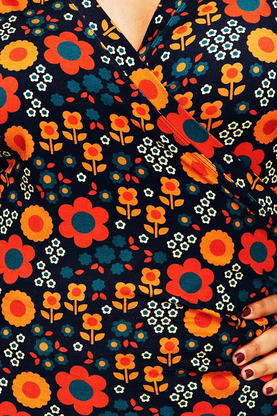 Tyget heter Nostalgi Orange och är ett retroinspirerat mönster med stilistiska blommor i stort och litet format. Blommorna går i olika orange, lejongula och petrolblå toner på en mörkblå botten.