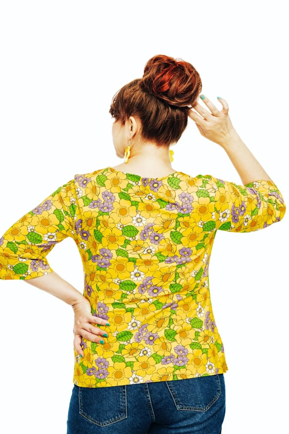 Tyget heter Humlesurr gul. Det här är Cissi och Selmas klassiska blommönster som återkommer varje säsong i olika färgställningar, som denna variant där gult och lila dominerar. Ett blommönster i underbar färgprakt i solgult, grönt och lila.